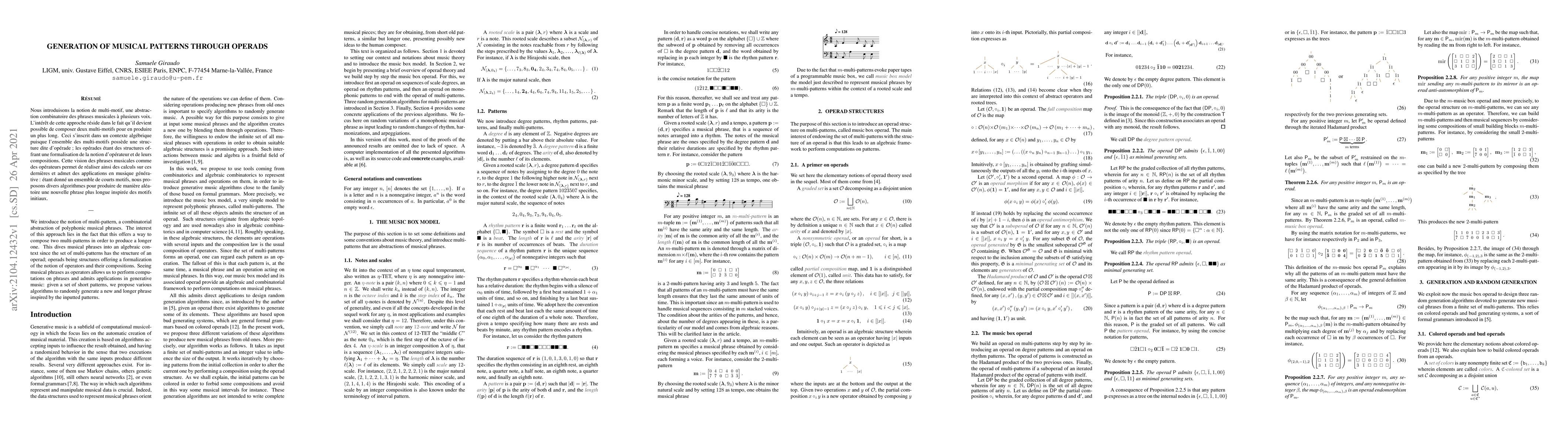 We introduce the notion of multi-pattern, a combinatorial abstraction of polyphonic musical phrases. The interest of this approach lies in the fact that this offers a way to compose two multi-patterns in order to produce a longer one. This dives musical phrases into an algebraic context since the set of multi-patterns has the structure of an operad; operads being structures offering a formalization of the notion of operators and their compositions. Seeing musical phrases as operators allows us to perform computations on phrases and admits applications in generative music: given a set of short patterns, we propose various algorithms to randomly generate a new and longer phrase inspired by the inputted patterns.