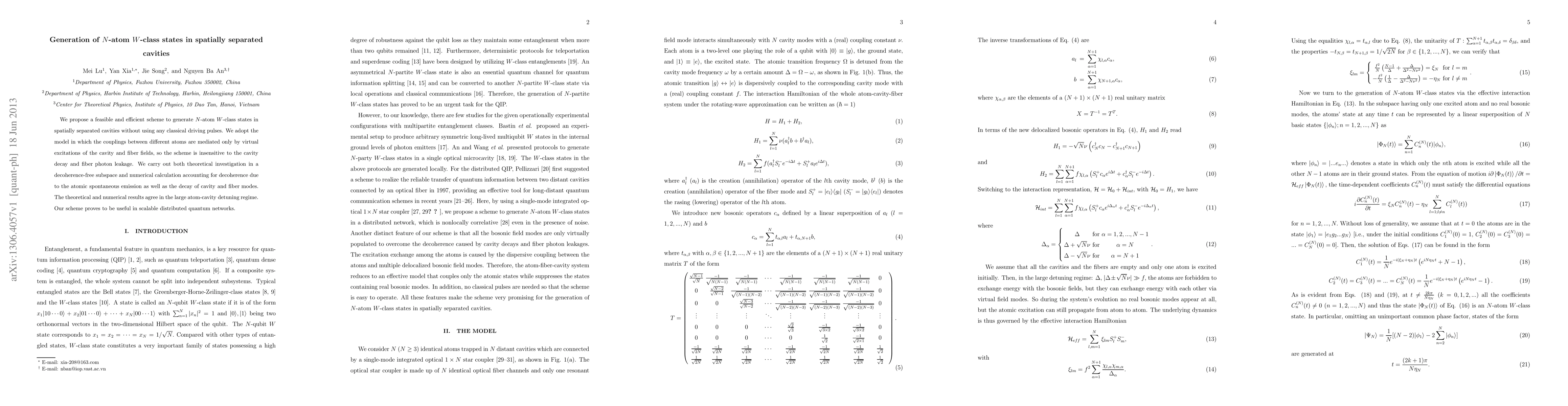 We propose a feasible and efficient scheme to generate $N$-atom $W$-class states in spatially separated cavities without using any classical driving pulses. We adopt the model in which the couplings between different atoms are mediated only by virtual excitations of the cavity and fiber fields, so the scheme is insensitive to the cavity decay and fiber photon leakage. We carry out both theoretical investigation in a decoherence-free subspace and numerical calculation accounting for decoherence due to the atomic spontaneous emission as well as the decay of cavity and fiber modes. The theoretical and numerical results agree in the large atom-cavity detuning regime. Our scheme proves to be useful in scalable distributed quantum networks.