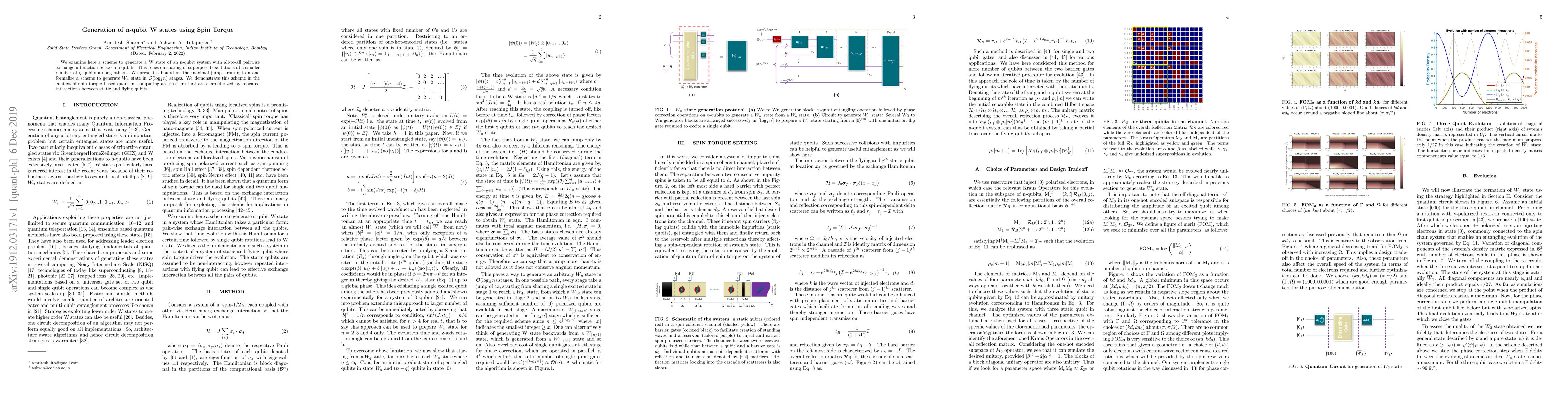 We examine here a scheme to generate a W state of an n-qubit system with all-to-all pairwise exchange interaction between n qubits. This relies on sharing of superposed excitations of a smaller number of $q$ qubits among others. We present a bound on the maximal jumps from q to n and formalize a scheme to generate $W_n$ state in $\mathcal{O}(\log_4 n)$ stages. We demonstrate this scheme in the context of spin torque based quantum computing architecture that are characterized by repeated interactions between static and flying qubits.