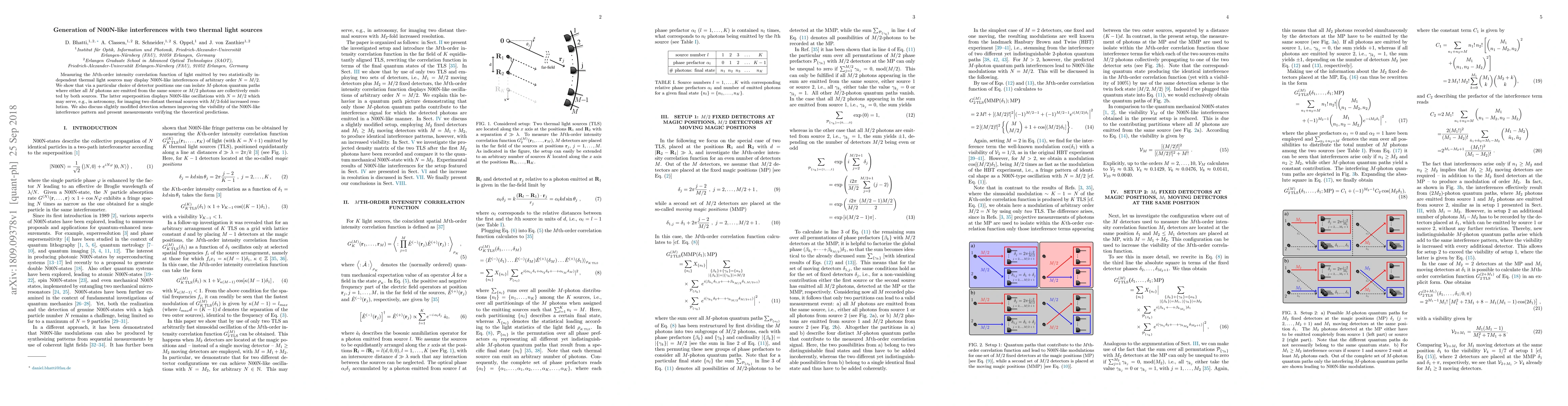 This paper explores the generation of N00N-like interferences using two independent thermal light sources, demonstrating that $M$th-order intensity correlation functions can exhibit N00N-like oscillations with order $N = M/2$. The study proposes specific detector configurations to isolate quantum paths and enhance the visibility of these interference patterns, with potential applications in high-resolution astronomical imaging.