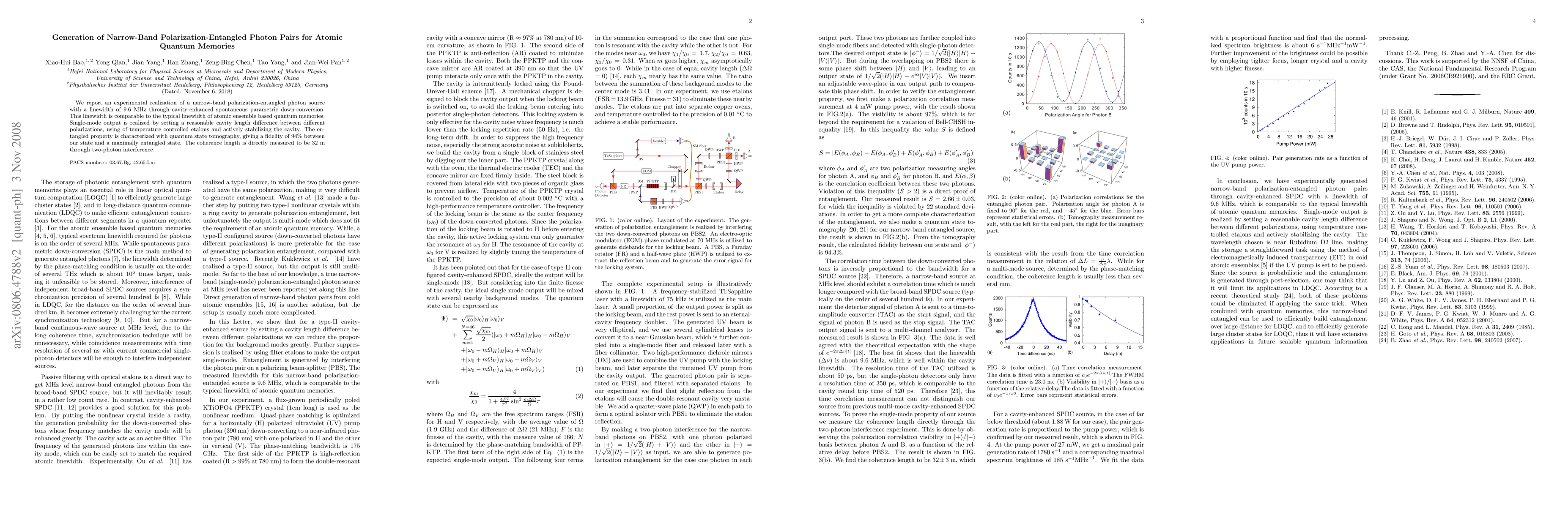 This paper presents a narrow-band polarization-entangled photon source with a linewidth of 9.6 MHz, achieved via cavity-enhanced spontaneous parametric down-conversion, suitable for atomic quantum memories. The entangled state is characterized with 94% fidelity and a coherence length of 32 m.