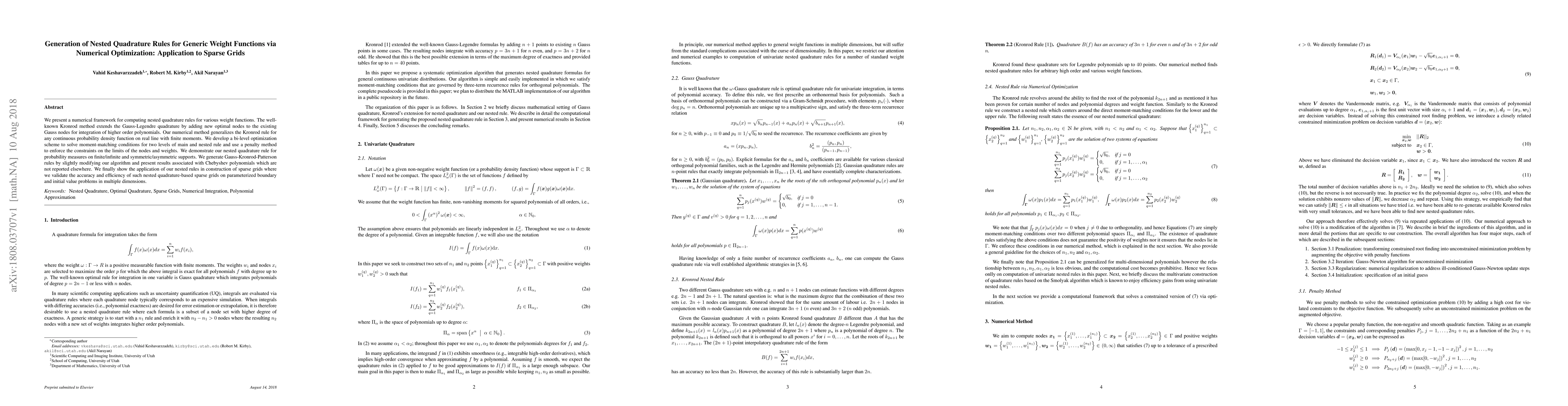 This paper introduces a numerical optimization method for generating nested quadrature rules for various weight functions, extending the Kronrod method to any continuous probability density function. It applies the developed nested quadrature rules to construct efficient sparse grids, demonstrating their accuracy and efficiency in solving multidimensional boundary and initial value problems.