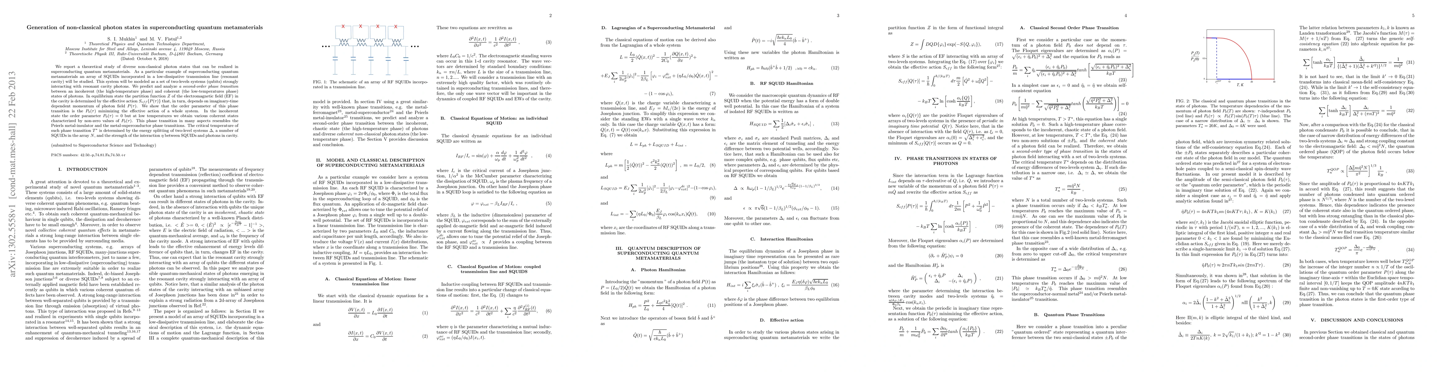 This paper theoretically explores the generation of non-classical photon states in superconducting quantum metamaterials, specifically focusing on an array of SQUIDs in a low-dissipative transmission line. It predicts a second-order phase transition between incoherent and coherent photon states, analogous to Peierls and metal-superconductor transitions, influenced by temperature, energy splitting, and interaction strength.