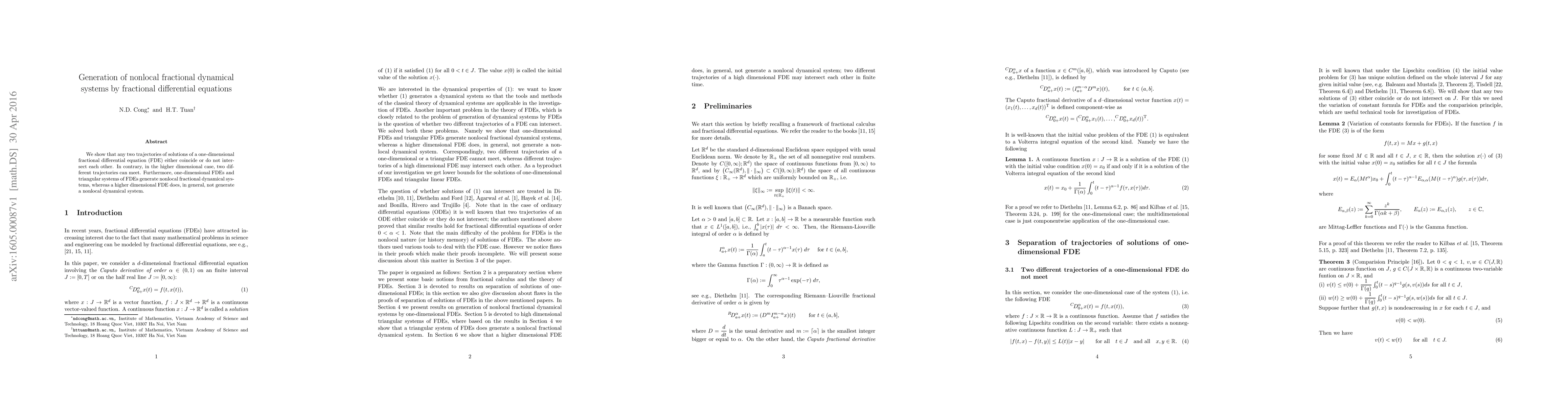 Summary: The paper demonstrates that one-dimensional fractional differential equations (FDEs) produce nonlocal dynamical systems where trajectories either coincide or do not intersect. In contrast, higher-dimensional FDEs can generate intersecting trajectories and generally do not form nonlocal dynamical systems.
