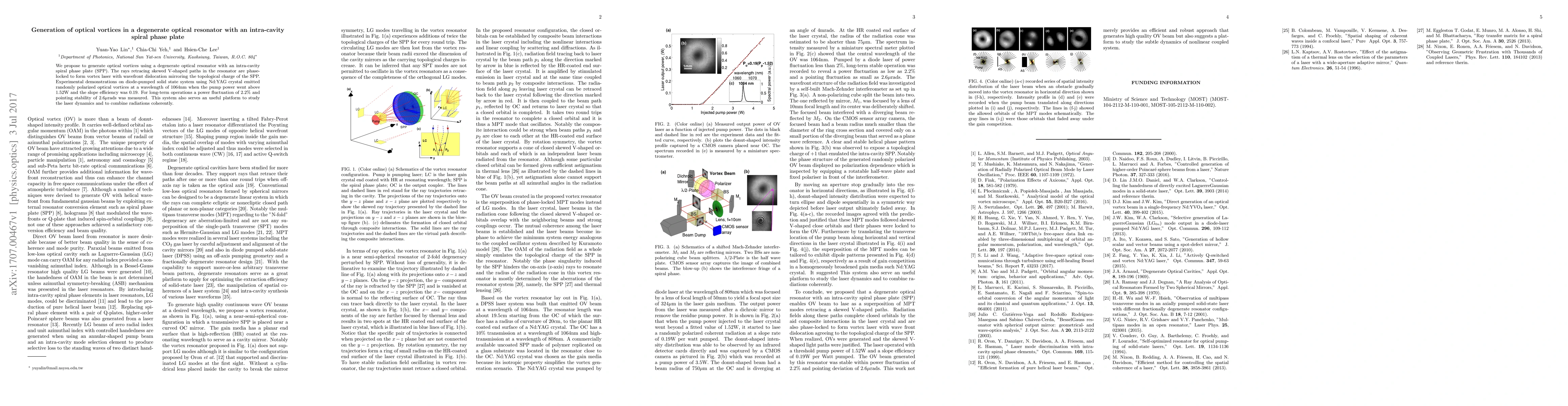 This paper proposes a method to generate optical vortices using a degenerate optical resonator with an intra-cavity spiral phase plate, demonstrating vortex laser emission at a wavelength of 1064nm and achieving stable long-term operation with low power fluctuation and pointing stability.