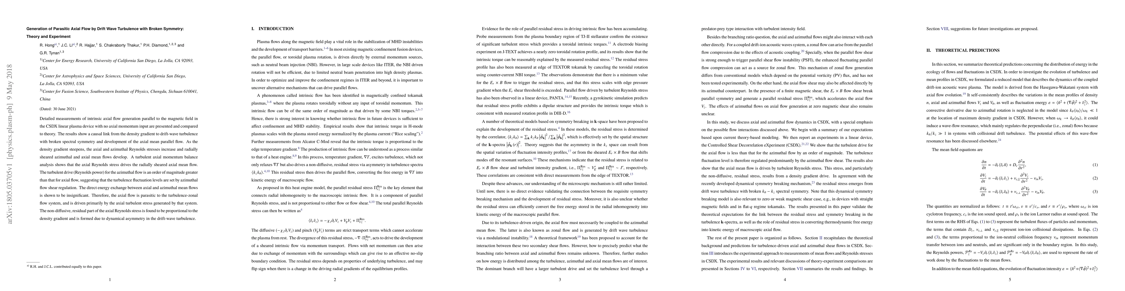 This paper presents experimental and theoretical evidence of axial flow generation in plasmas driven by drift-wave turbulence with broken symmetry, showing that the axial flow is a parasitic effect primarily driven by axial turbulent stresses. The study finds that the turbulence fluctuation levels are regulated by azimuthal flow shear, with the axial flow being indirectly influenced by the turbulence-zonal flow system.