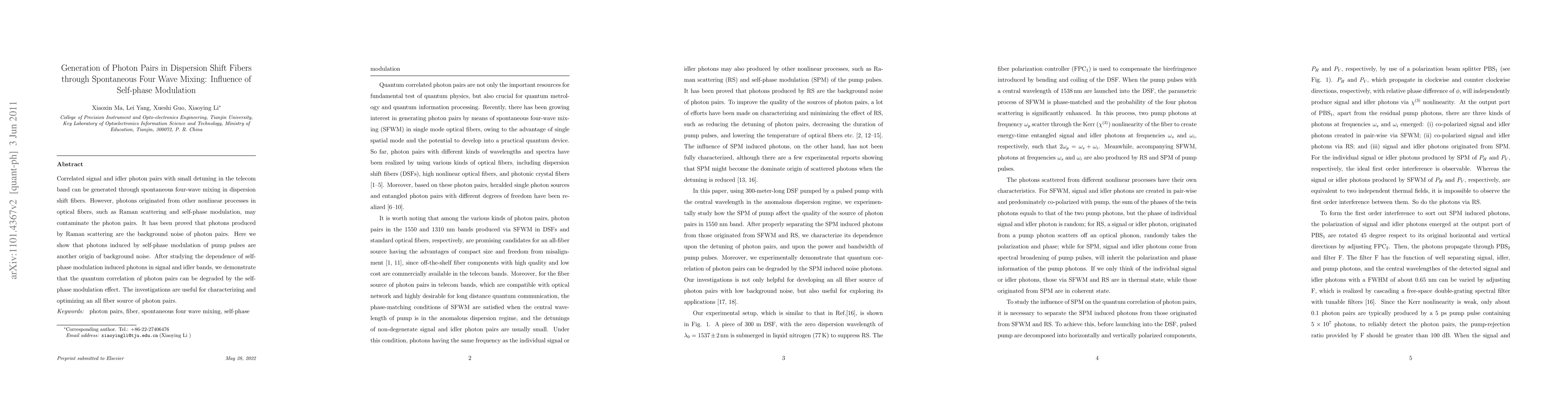 This paper investigates the generation of photon pairs via spontaneous four-wave mixing in dispersion shift fibers, highlighting the impact of self-phase modulation as a source of background noise that degrades the quantum correlation of the photon pairs. The study provides insights for optimizing fiber-based photon pair sources.