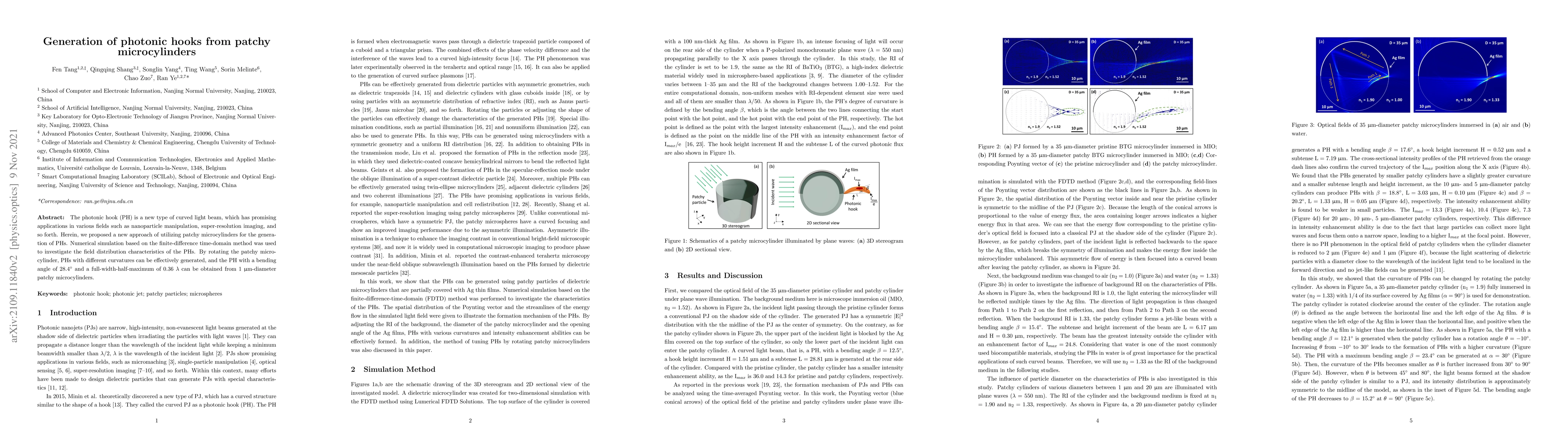 The research proposes a novel method to generate curved light beams called photonic hooks (PHs) using rotating patchy microcylinders. Numerical simulations reveal that PHs with varying curvatures can be produced, with a 28.4° bending angle and 0.36λ full-width-half-maximum achieved from 1µm-diameter patchy microcylinders.