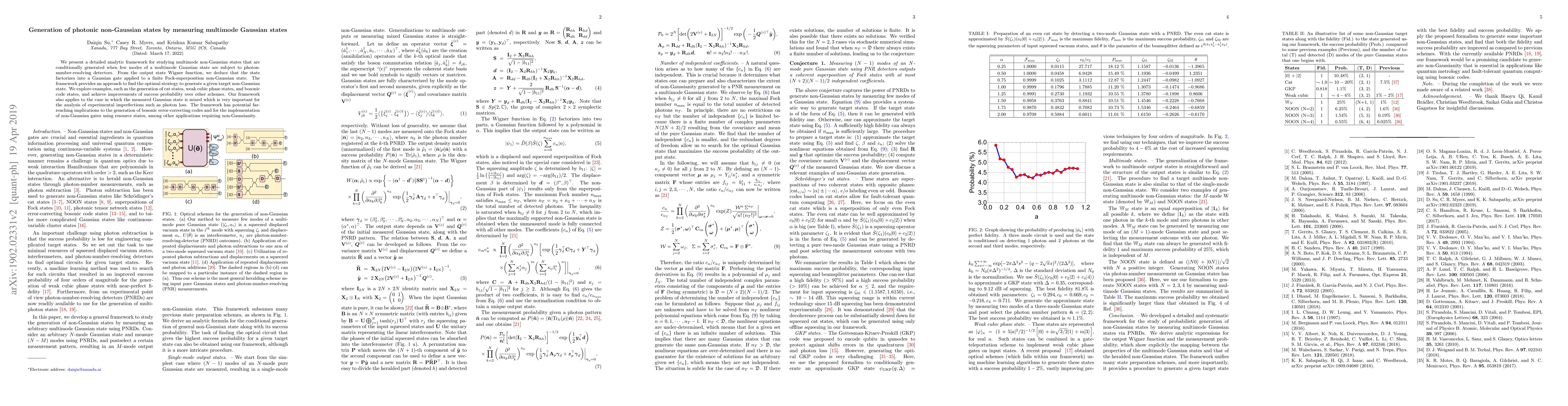 This paper develops an analytic framework for generating multimode non-Gaussian photonic states by measuring few modes of a Gaussian state with photon-number-resolving detectors. The method shows improved success probabilities for generating specific non-Gaussian states like cat states and bosonic code states, and is applicable to mixed Gaussian states, addressing experimental imperfections.