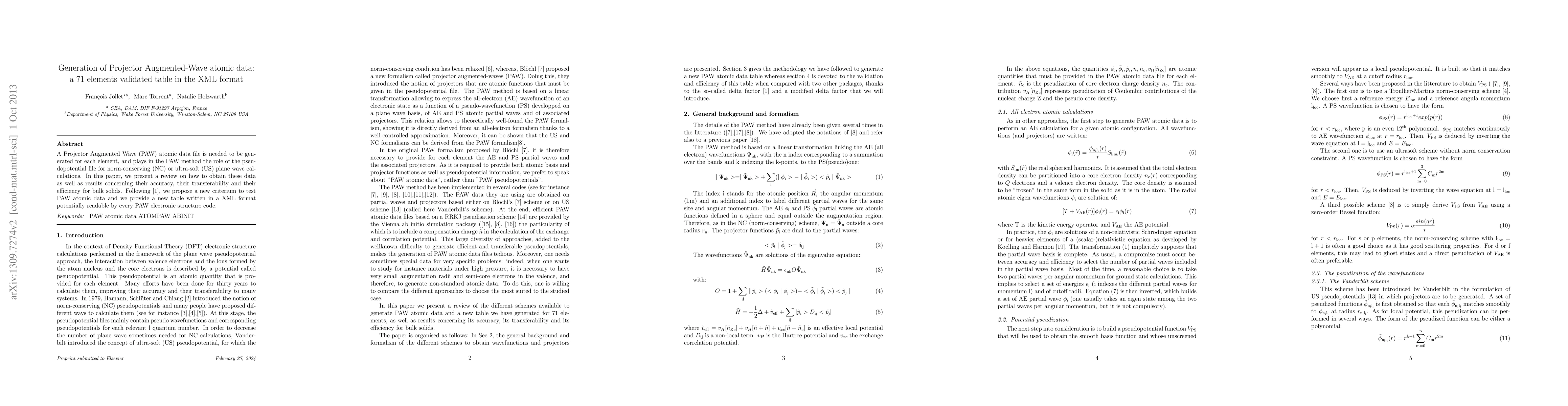 This paper reviews the generation of Projector Augmented Wave (PAW) atomic data for 71 elements, focusing on accuracy, transferability, and efficiency for bulk solids. It introduces a new criterion for PAW data validation and presents a comprehensive XML-formatted table of these data, designed for use in various PAW electronic structure calculations.