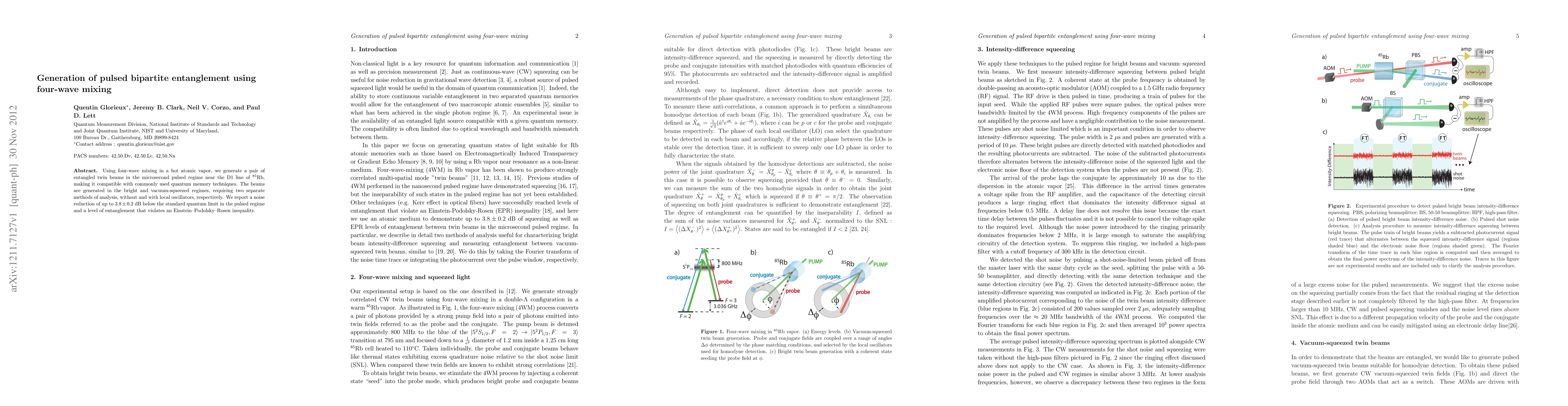 This paper details the generation of pulsed bipartite entanglement via four-wave mixing in a hot $^{85}$Rb vapor, achieving noise reduction below the standard quantum limit and demonstrating entanglement that violates an Einstein--Podolsky--Rosen inequality. The method is compatible with quantum memory techniques.