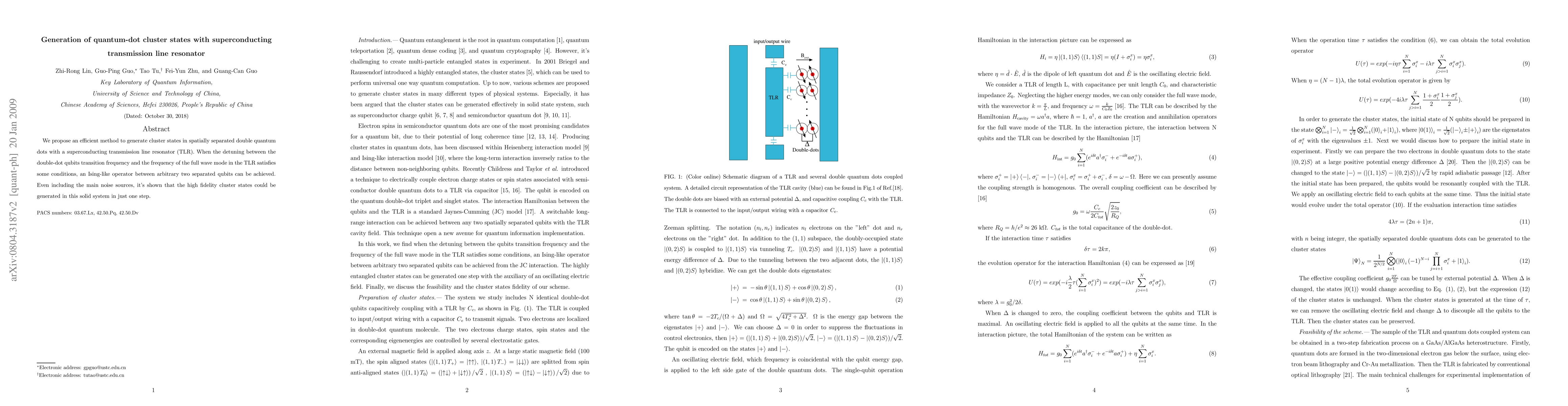 This paper proposes an efficient method to generate high-fidelity cluster states in spatially separated double quantum dots using a superconducting transmission line resonator. By tuning the detuning between qubit transition frequencies and the resonator's mode, an Ising-like interaction is achieved, enabling the generation of cluster states in a single step despite main noise sources.