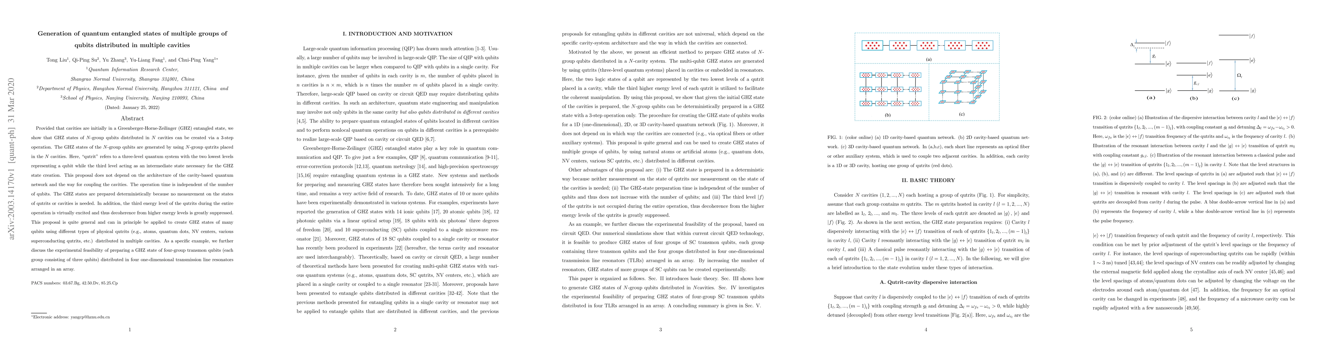 This paper proposes a method for generating Greenberger-Horne-Zeilinger (GHZ) entangled states of multiple groups of qubits distributed in separate cavities using N-group qutrits. The process is deterministic, architecture-independent, and suppresses decoherence, making it applicable to various physical systems.