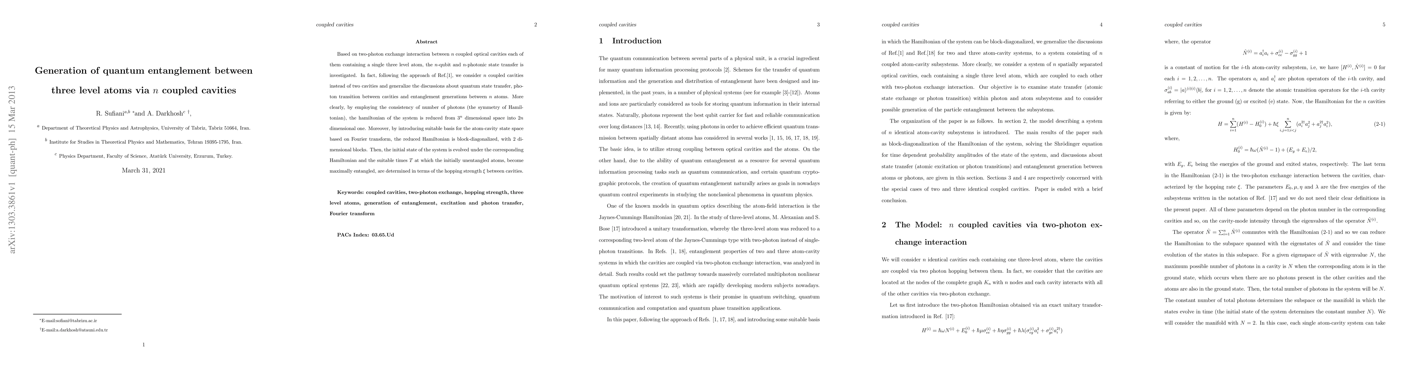 This paper explores the generation of quantum entanglement between $n$ three-level atoms via $n$ coupled optical cavities, utilizing two-photon exchange interactions. The study reduces the system's Hamiltonian from a $3^n$ dimensional space to a 2n dimensional one, facilitating the analysis of entanglement generation and state transfer between $n$ atoms.
