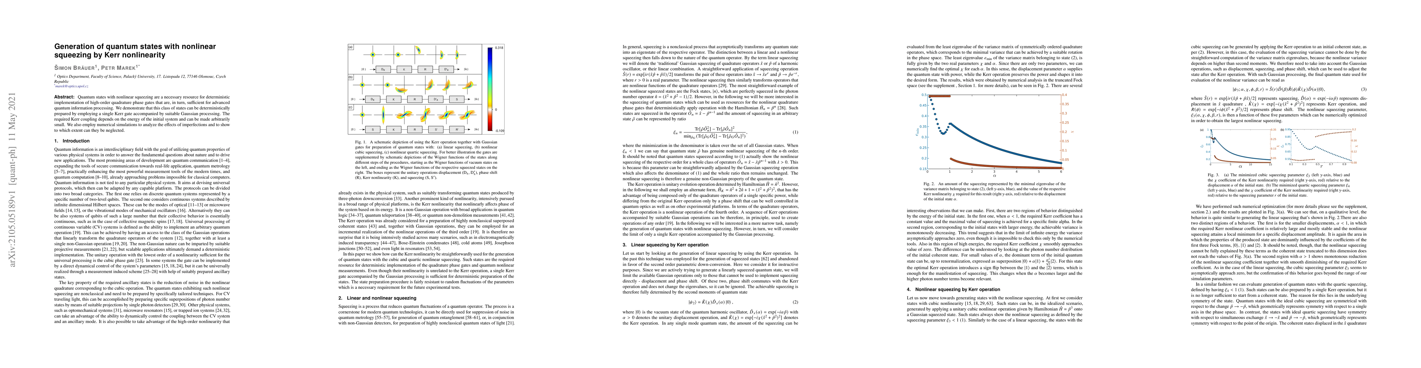 This paper demonstrates the generation of quantum states with nonlinear squeezing using Kerr nonlinearity, which is essential for advanced quantum information processing. The authors achieve this deterministically through a single Kerr gate and Gaussian processing, showing that Kerr coupling can be minimized and imperfections can be largely neglected.