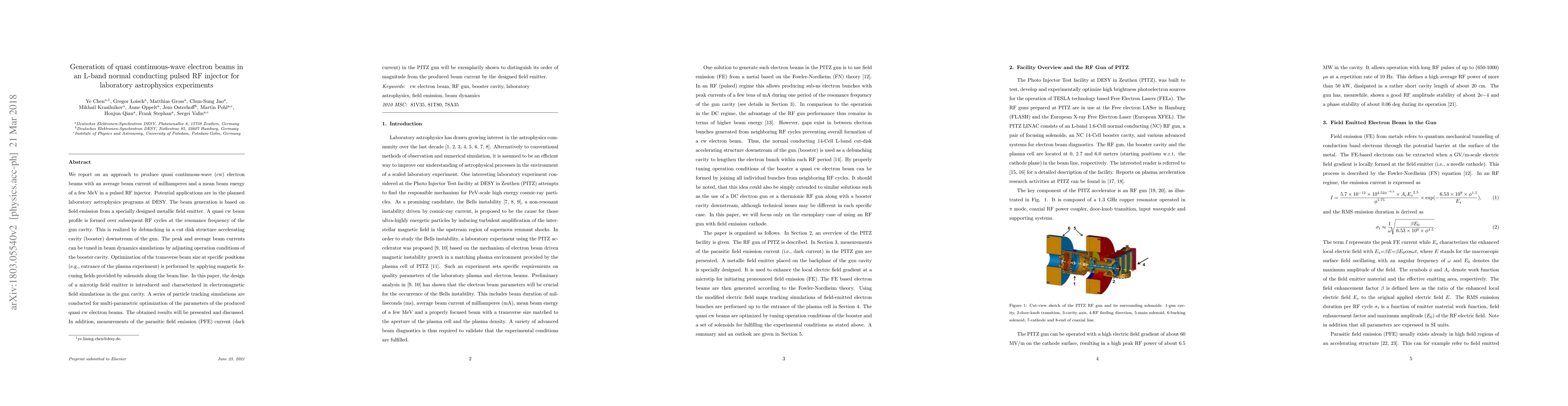 We report on an approach to produce quasi continuous-wave (cw) electron beams with an average beam current of milliamperes and a mean beam energy of a few MeV in a pulsed RF injector. Potential applications are in the planned laboratory astrophysics programs at DESY. The beam generation is based on field emission from a specially designed metallic field emitter. A quasi cw beam profile is formed over subsequent RF cycles at the resonance frequency of the gun cavity. This is realized by debunching in a cut disk structure accelerating cavity (booster) downstream of the gun. The peak and average beam currents can be tuned in beam dynamics simulations by adjusting operation conditions of the booster cavity. Optimization of the transverse beam size at specific positions (e.g., entrance of the plasma experiment) is performed by applying magnetic focusing fields provided by solenoids along the beam line. In this paper, the design of a microtip field emitter is introduced and characterized in electromagnetic field simulations in the gun cavity. A series of particle tracking simulations are conducted for multi-parametric optimization of the parameters of the produced quasi cw electron beams. The obtained results will be presented and discussed. In addition, measurements of the parasitic field emission (PFE) current (dark current) in the PITZ gun will be exemplarily shown to distinguish its order of magnitude from the produced beam current by the designed field emitter.