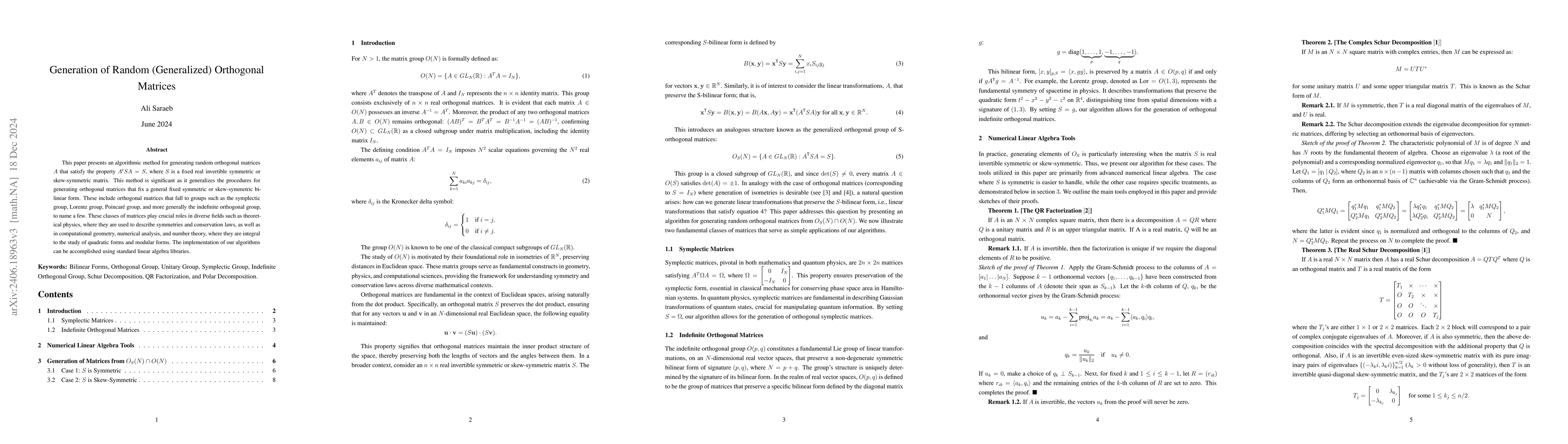 This paper presents an algorithmic method for generating random orthogonal matrices \(A\) that satisfy the property \(A^t S A = S\), where \(S\) is a fixed real invertible symmetric or skew-symmetric matrix. This method is significant as it generalizes the procedures for generating orthogonal matrices that fix a general fixed symmetric or skew-symmetric bilinear form. These include orthogonal matrices that fall to groups such as the symplectic group, Lorentz group, Poincar\'e group, and more generally the indefinite orthogonal group, to name a few. These classes of matrices play crucial roles in diverse fields such as theoretical physics, where they are used to describe symmetries and conservation laws, as well as in computational geometry, numerical analysis, and number theory, where they are integral to the study of quadratic forms and modular forms. The implementation of our algorithms can be accomplished using standard linear algebra libraries.