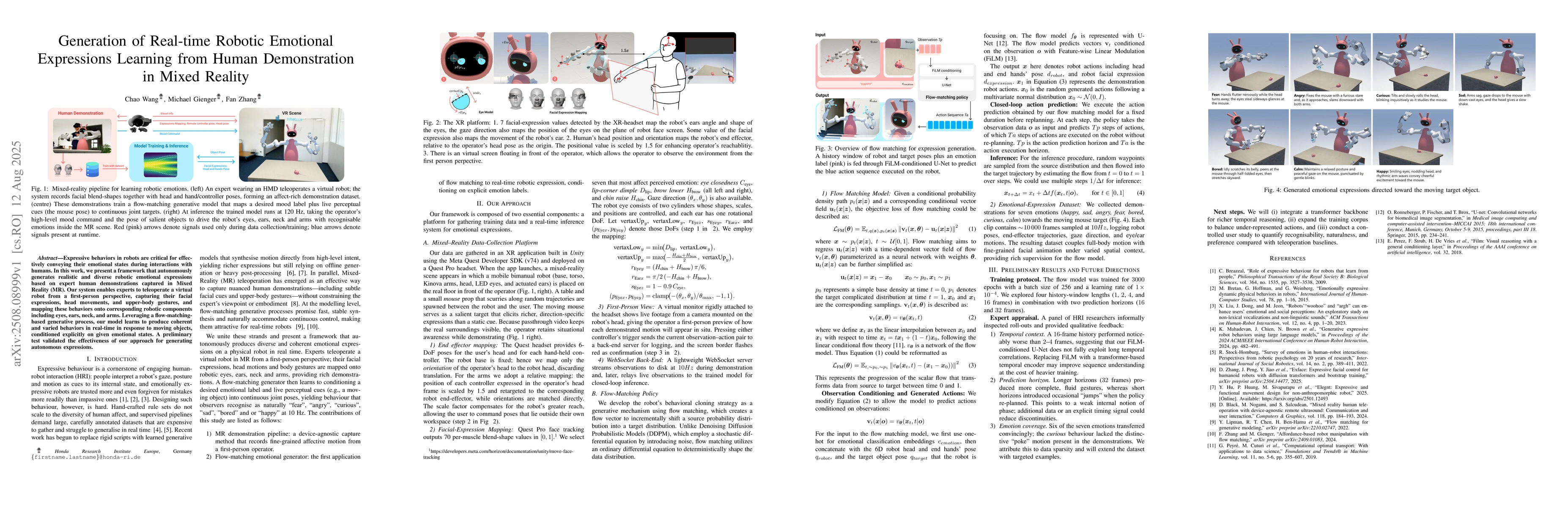 Expressive behaviors in robots are critical for effectively conveying their emotional states during interactions with humans. In this work, we present a framework that autonomously generates realistic and diverse robotic emotional expressions based on expert human demonstrations captured in Mixed Reality (MR). Our system enables experts to teleoperate a virtual robot from a first-person perspective, capturing their facial expressions, head movements, and upper-body gestures, and mapping these behaviors onto corresponding robotic components including eyes, ears, neck, and arms. Leveraging a flow-matching-based generative process, our model learns to produce coherent and varied behaviors in real-time in response to moving objects, conditioned explicitly on given emotional states. A preliminary test validated the effectiveness of our approach for generating autonomous expressions.