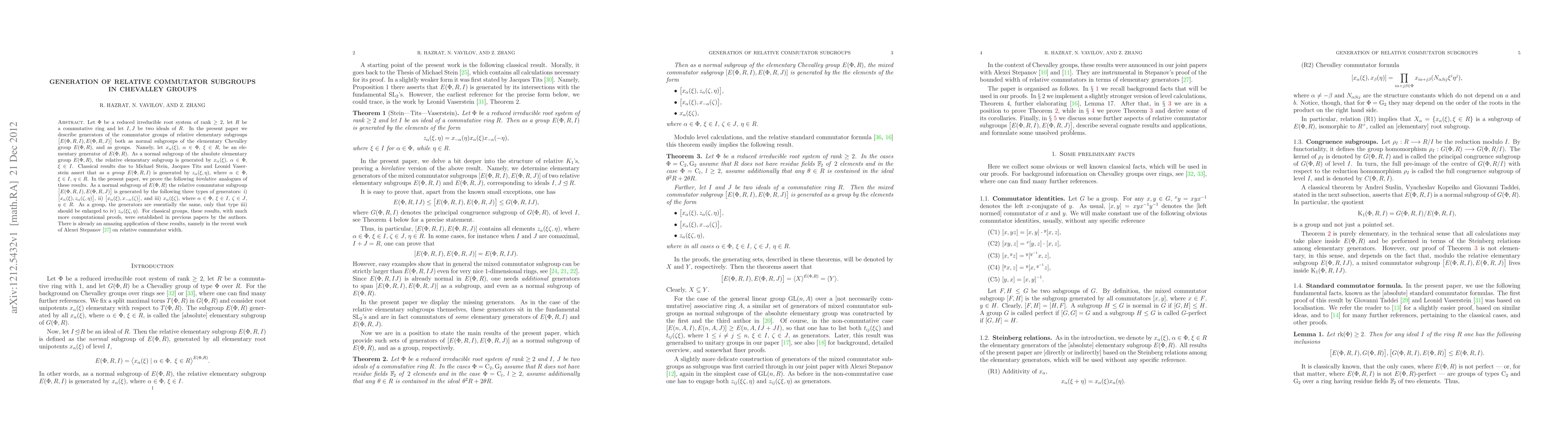 Let $\Phi$ be a reduced irreducible root system of rank $\ge 2$, let $R$ be a commutative ring and let $I,J$ be two ideals of $R$. In the present paper we describe generators of the commutator groups of relative elementary subgroups $\big[E(\Phi,R,I),E(\Phi,R,J)\big]$ both as normal subgroups of the elementary Chevalley group $E(\Phi,R)$, and as groups. Namely, let $x_{\a}(\xi)$, $\a\in\Phi$, $\xi\in R$, be an elementary generator of $E(\Phi,R)$. As a normal subgroup of the absolute elementary group $E(\Phi,R)$, the relative elementary subgroup is generated by $x_{\a}(\xi)$, $\a\in\Phi$, $\xi\in I$. Classical results due to Michael Stein, Jacques Tits and Leonid Vaserstein assert that as a group $E(\Phi,R,I)$ is generated by $z_{\a}(\xi,\eta)$, where $\a\in\Phi$, $\xi\in I$, $\eta\in R$. In the present paper, we prove the following birelative analogues of these results. As a normal subgroup of $E(\Phi,R)$ the relative commutator subgroup $\big[E(\Phi,R,I),E(\Phi,R,J)\big]$ is generated by the following three types of generators: i) $\big[x_{\alpha}(\xi),z_{\alpha}(\zeta,\eta)\big]$, ii) $\big[x_{\alpha}(\xi),x_{-\alpha}(\zeta)\big]$, and iii) $x_{\alpha}(\xi\zeta)$, where $\alpha\in\Phi$, $\xi\in I$, $\zeta\in J$, $\eta\in R$. As a group, the generators are essentially the same, only that type iii) should be enlarged to iv) $z_{\alpha}(\xi\zeta,\eta)$. For classical groups, these results, with much more computational proofs, were established in previous papers by the authors. There is already an amazing application of these results, namely in the recent work of Alexei Stepanov on relative commutator width.