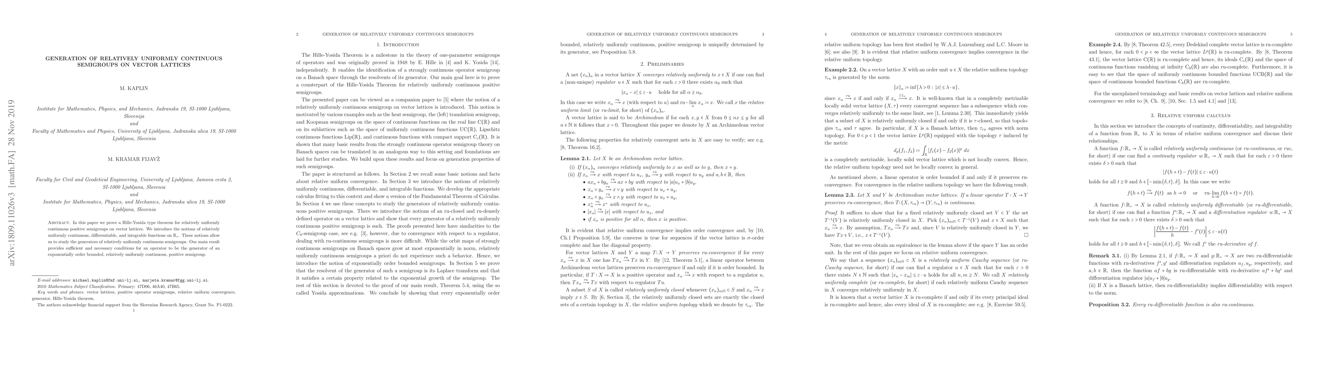 In this paper we prove a Hille-Yosida type theorem for relatively uniformly continuous positive semigroups on vector lattices. We introduce the notions of relatively uniformly continuous, differentiable, and integrable functions on $\mathbb{R}_+$. These notions allow us to study the generators of relatively uniformly continuous semigroups. Our main result provides sufficient and necessary conditions for an operator to be the generator of an exponentially order bounded, relatively uniformly continuous, positive semigroup.
