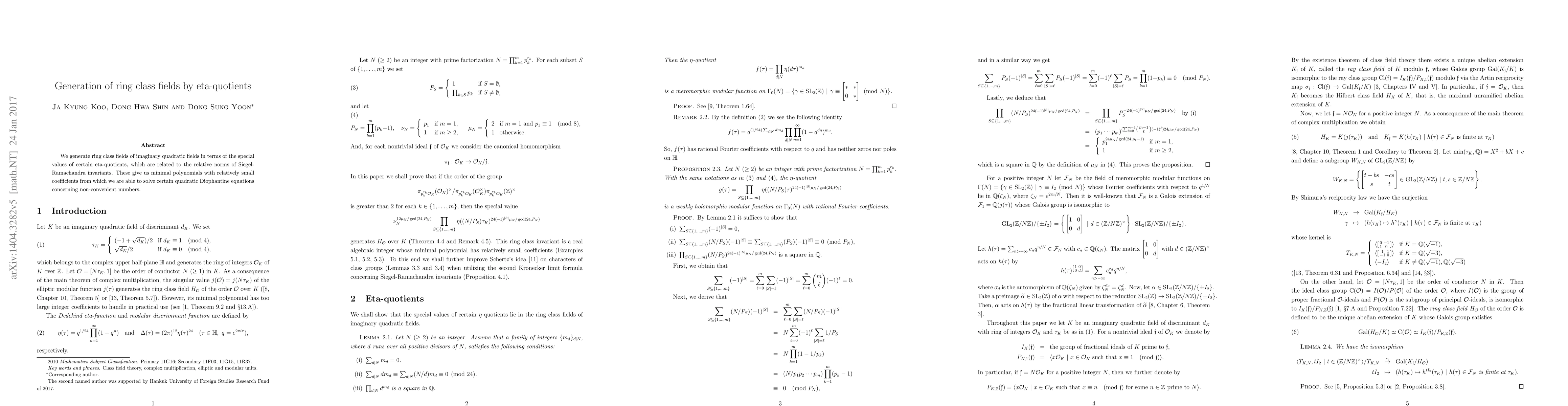 This paper generates ring class fields for imaginary quadratic fields using special values of eta-quotients, providing minimal polynomials with small coefficients to solve specific quadratic Diophantine equations. The approach leverages the connection between eta-quotients and Siegel-Ramachandra invariants.
