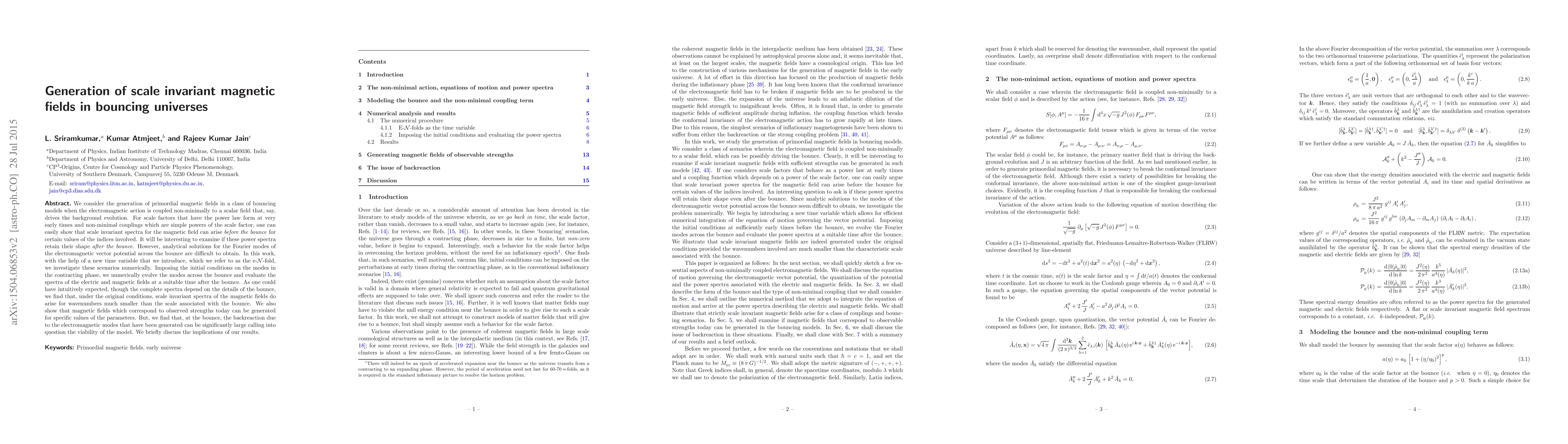 This paper investigates the generation of scale invariant primordial magnetic fields in bouncing universe models where the electromagnetic action is coupled non-minimally to a scalar field. Numerical simulations reveal that scale invariant magnetic field spectra can arise before the bounce, and retain their shape post-bounce for certain wavenumbers, though the model's viability is questioned due to significant backreaction at the bounce.