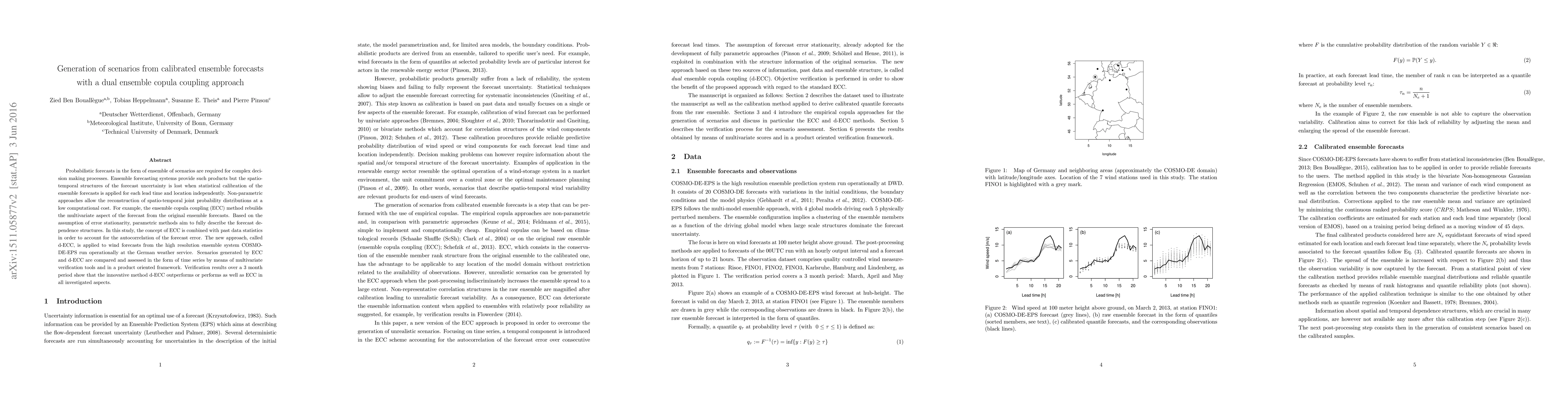 This paper introduces a dual ensemble copula coupling (d-ECC) approach that combines ensemble copula coupling with past data statistics to reconstruct spatio-temporal joint probability distributions in ensemble forecasts, preserving multivariate forecast dependence structures. The d-ECC method outperforms or matches the standard ECC method in generating more accurate wind forecast scenarios, as verified using multivariate verification tools over a three-month period.
