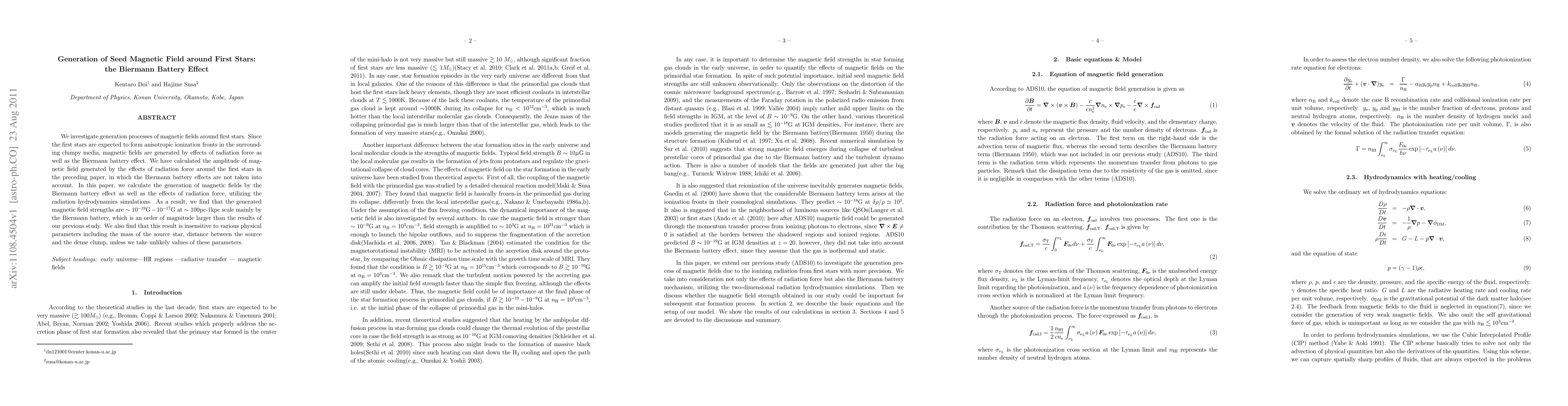This paper investigates the generation of magnetic fields around first stars, focusing on the Biermann battery effect and radiation force. It finds that the Biermann battery effect generates magnetic fields in the range of 10^-19G to 10^-17G at scales of 100pc to 1kpc, an order of magnitude larger than previous estimates, and is largely insensitive to various physical parameters.