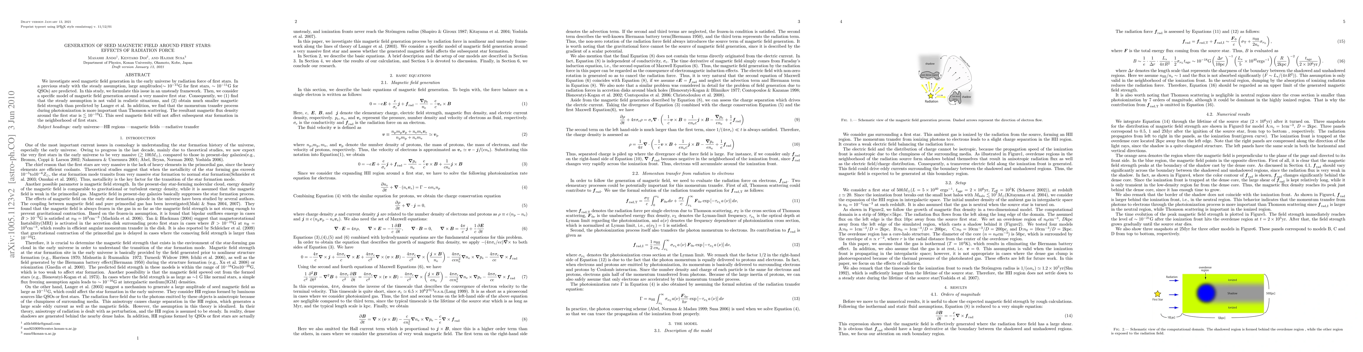 This study examines the generation of seed magnetic fields around the first stars in the early universe, finding that the radiation force from these stars produces much smaller magnetic fields (<10^{-19}G) than previously predicted, due to the importance of momentum transfer during photoionization rather than Thomson scattering.