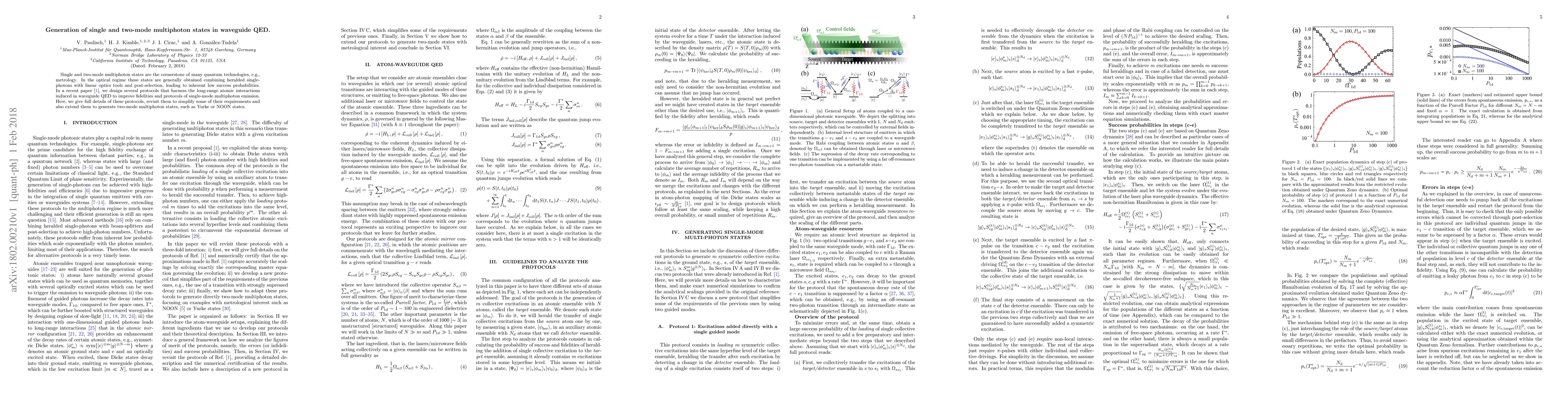 The paper presents detailed protocols and analytical expressions for generating single and two-mode multiphoton states using waveguide QED, including error analysis and potential improvements.