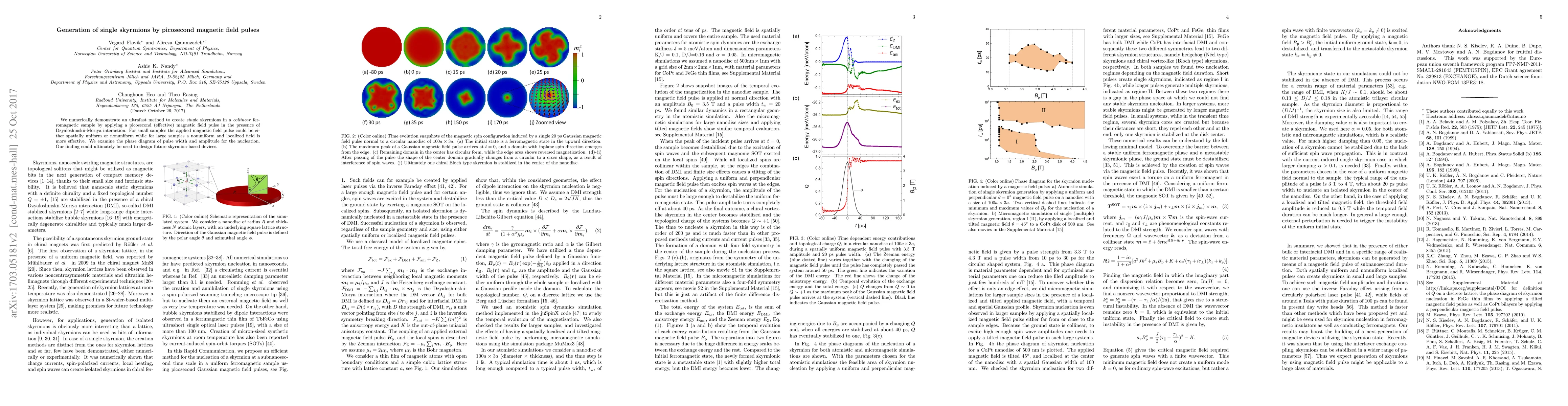 We numerically demonstrate an ultrafast method to create $\textit{single}$ skyrmions in a $\textit{collinear}$ ferromagnetic sample by applying a picosecond (effective) magnetic field pulse in the presence of Dzyaloshinskii-Moriya interaction. For small samples the applied magnetic field pulse could be either spatially uniform or nonuniform while for large samples a nonuniform and localized field is more effective. We examine the phase diagram of pulse width and amplitude for the nucleation. Our finding could ultimately be used to design future skyrmion-based devices.
