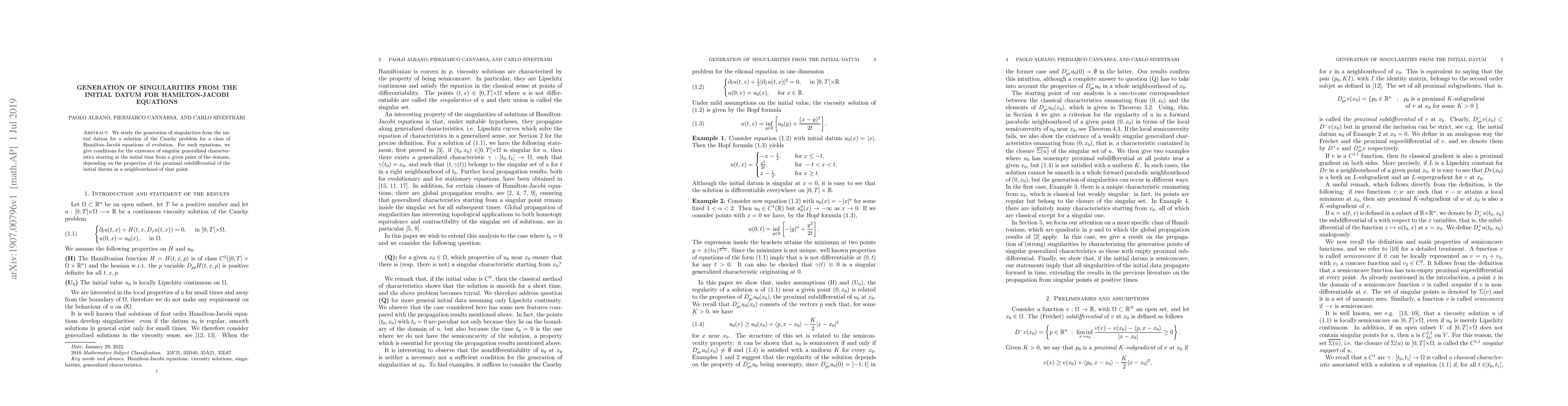 We study the generation of singularities from the initial datum for a solution of the Cauchy problem for a class of Hamilton-Jacobi equations of evolution. For such equations, we give conditions for the existence of singular generalized characteristics starting at the initial time from a given point of the domain, depending on the properties of the proximal subdifferential of the initial datum in a neighbourhood of that point.