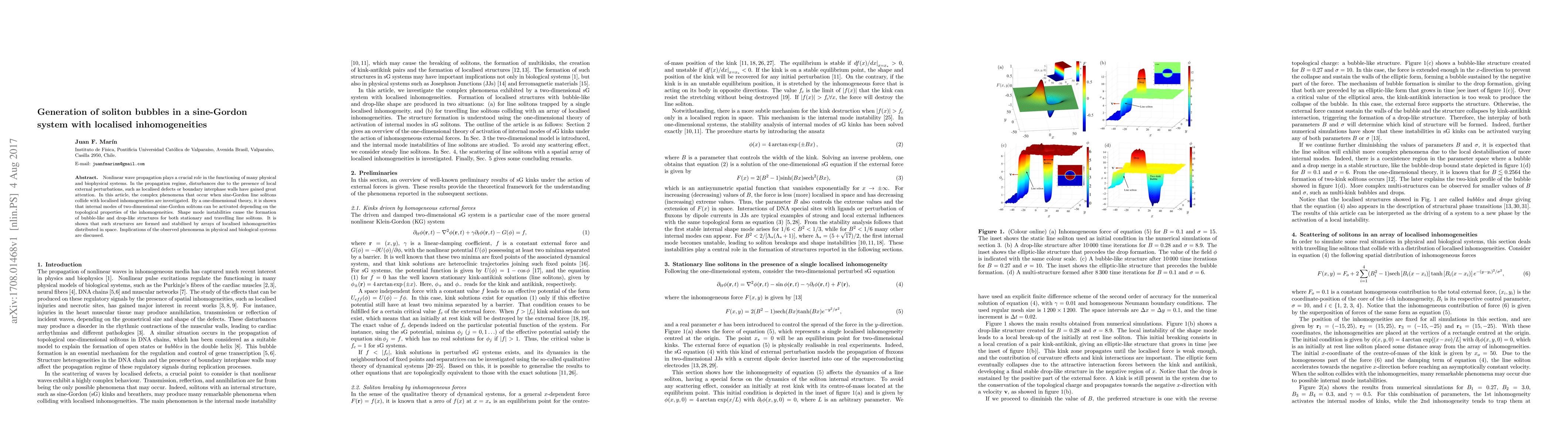 Nonlinear wave propagation plays a crucial role in the functioning of many physical and biophysical systems. In the propagation regime, disturbances due to the presence of local external perturbations, such as localised defects or boundary interphase walls have gained great attention. In this article, the complex phenomena that occur when sine-Gordon line solitons collide with localised inhomogeneities are investigated. By a one-dimensional theory, it is shown that internal modes of two-dimensional sine-Gordon solitons can be activated depending on the topological properties of the inhomogeneities. Shape mode instabilities cause the formation of bubble-like and drop-like structures for both stationary and travelling line solitons. It is shown that such structures are formed and stabilised by arrays of localised inhomogeneities distributed in space. Implications of the observed phenomena in physical and biological systems are discussed.