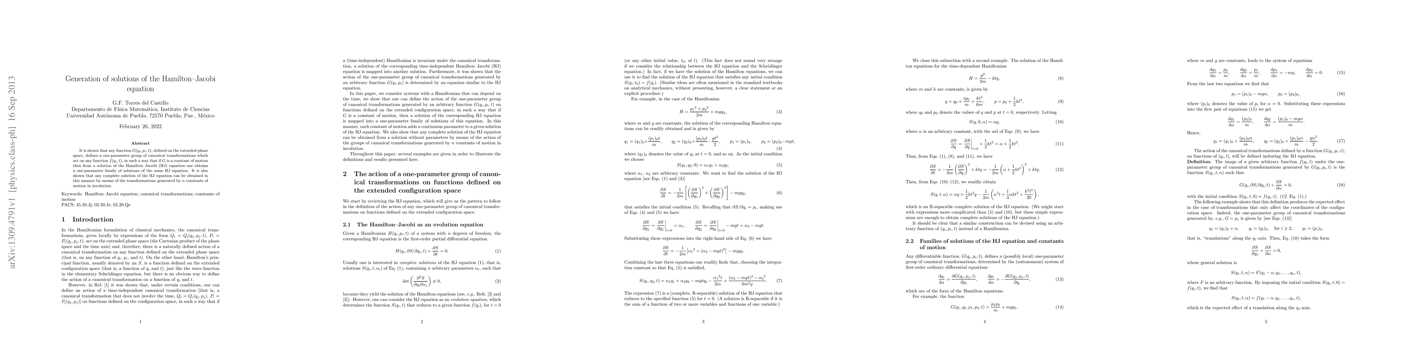 It is shown that any function $G(q_{i}, p_{i}, t)$, defined on the extended phase space, defines a one-parameter group of canonical transformations which act on any function $f(q_{i}, t)$, in such a way that if $G$ is a constant of motion then from a solution of the Hamilton-Jacobi (HJ) equation one obtains a one-parameter family of solutions of the same HJ equation. It is also shown that any complete solution of the HJ equation can be obtained in this manner by means of the transformations generated by $n$ constants of motion in involution.