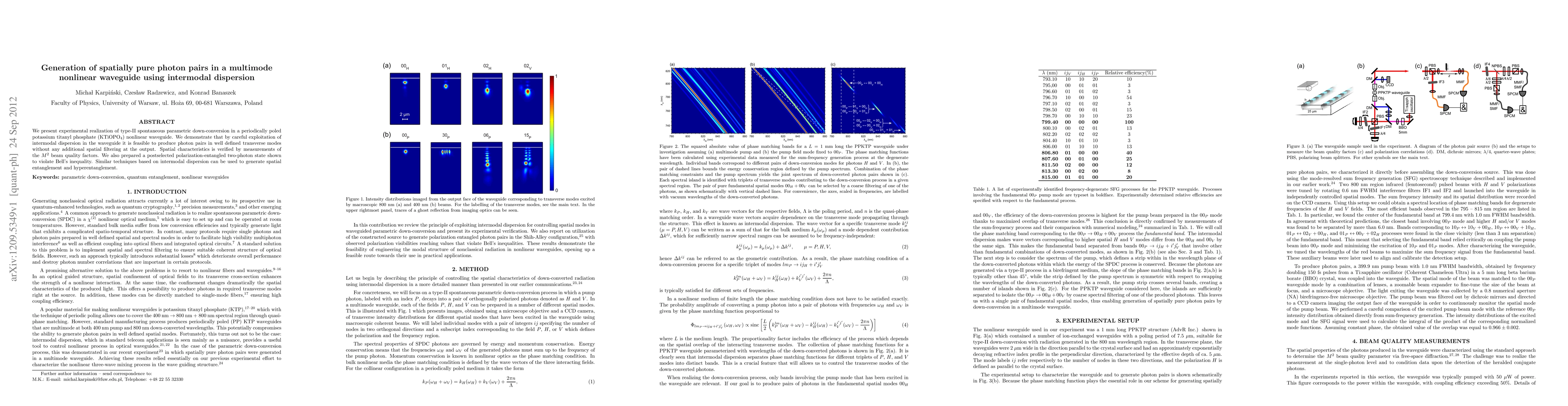 This paper demonstrates the generation of spatially pure photon pairs in a multimode nonlinear waveguide using intermodal dispersion, achieving high-quality photon pairs without additional spatial filtering. The technique was validated by measuring M2 beam quality factors and showing a postselected polarization-entangled state that violates Bell's inequality.