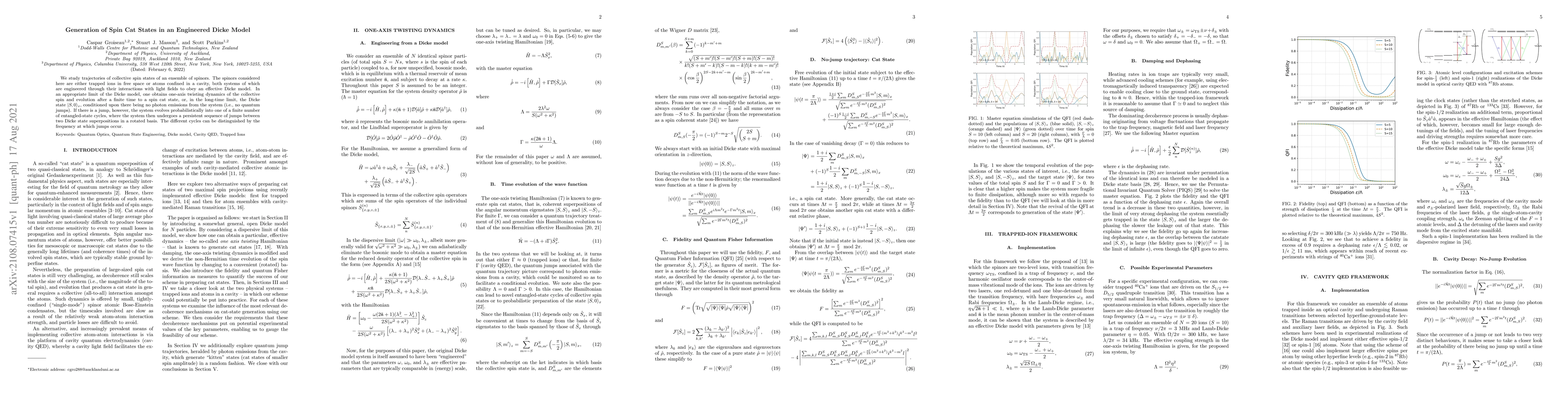 This paper investigates the generation of spin cat states in engineered Dicke models using trapped ions or cavity-confined atoms interacting with light fields. The system can evolve into a spin cat state or a Dicke state without photon emissions, but quantum jumps lead to probabilistic transitions between entangled state cycles.