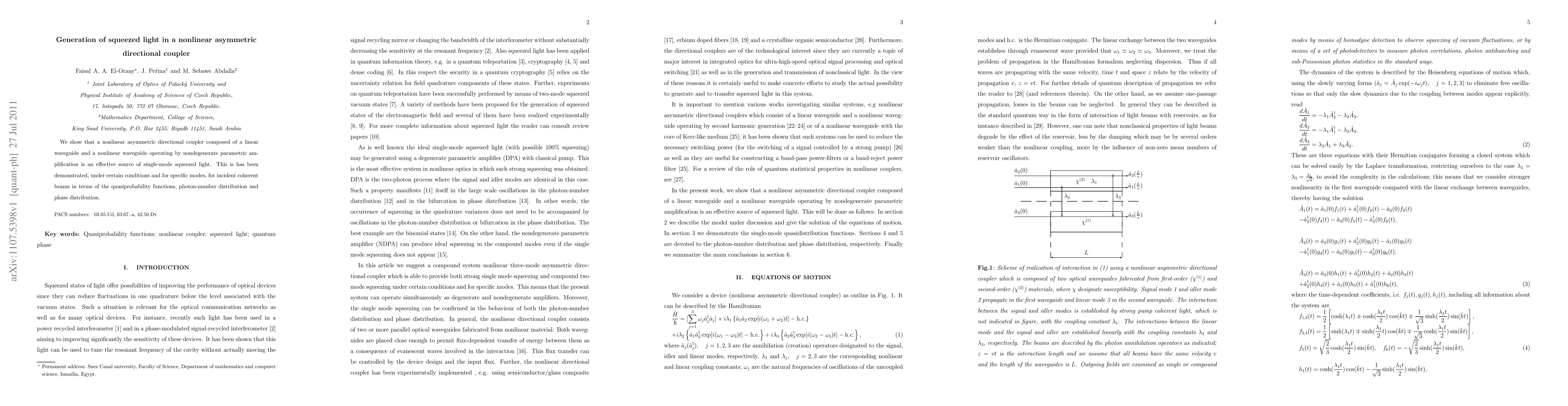 Title: Generation of squeezed light in a nonlinear asymmetric directional coupler Summary: A nonlinear asymmetric directional coupler produces single-mode squeezed light through nondegenerate parametric amplification, demonstrating its effectiveness under specific conditions and modes, validated by quasiprobability functions, photon-number distribution, and phase distribution.