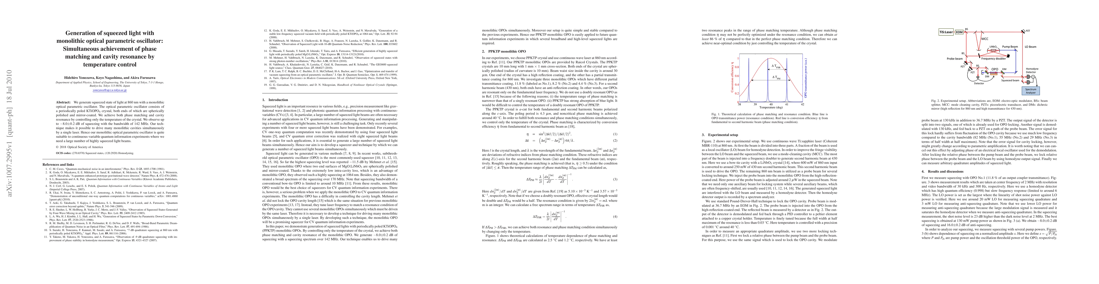 This paper describes the generation of squeezed light at 860 nm using a monolithic optical parametric oscillator with a periodically poled KTiOPO_4 crystal. The authors achieve phase matching and cavity resonance solely through temperature control, achieving up to -8.0 dB of squeezing within a 142 MHz bandwidth.