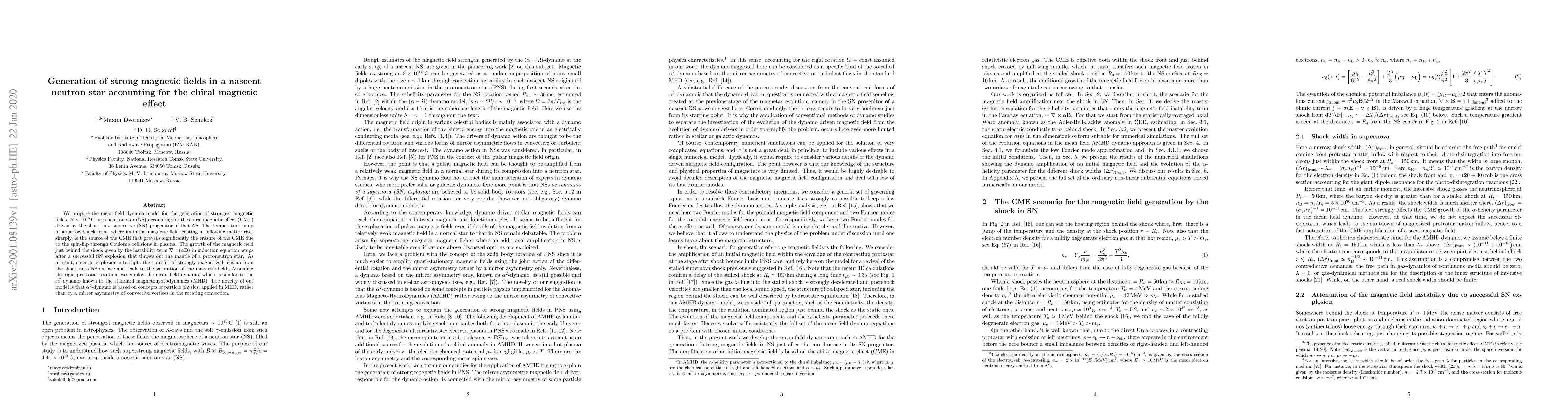 This paper proposes a mean field dynamo model to generate extremely strong magnetic fields, up to $10^{15}\,{\rm G}$, in nascent neutron stars, incorporating the chiral magnetic effect driven by supernova shock waves. The model highlights the role of temperature jumps at shock fronts in sustaining these magnetic fields, contrasting with the standard $\alpha^2$-dynamo based on convective asymmetries.
