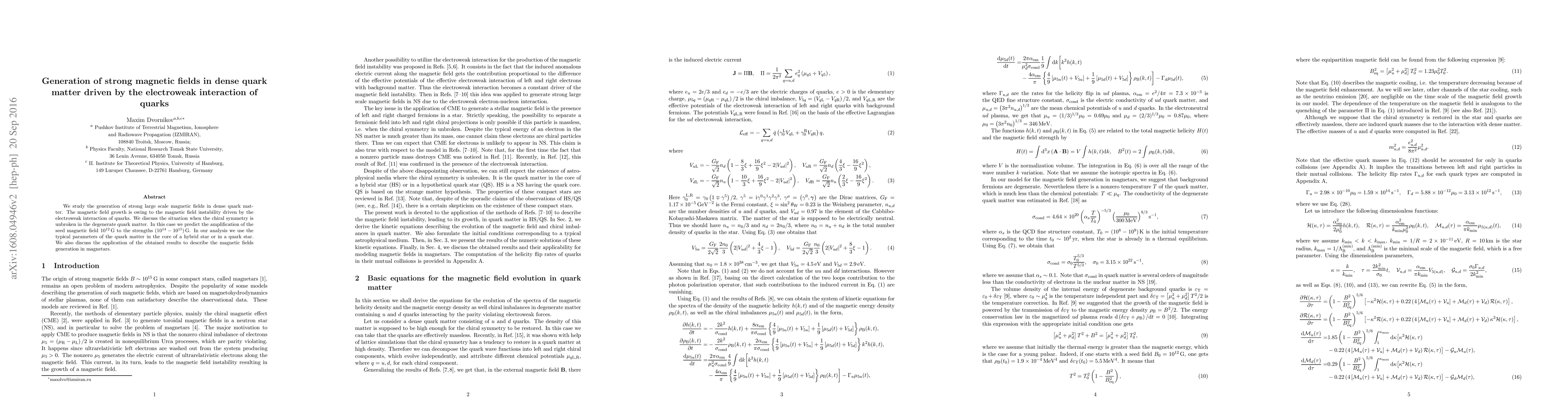 This paper investigates the generation of large-scale magnetic fields in dense quark matter through magnetic field instability driven by quark electroweak interactions. It predicts the amplification of initial magnetic fields from $10^{12}\,\text{G}$ to $(10^{14}-10^{15})\,\text{G}$ when chiral symmetry is unbroken, relevant for hybrid stars and magnetars.