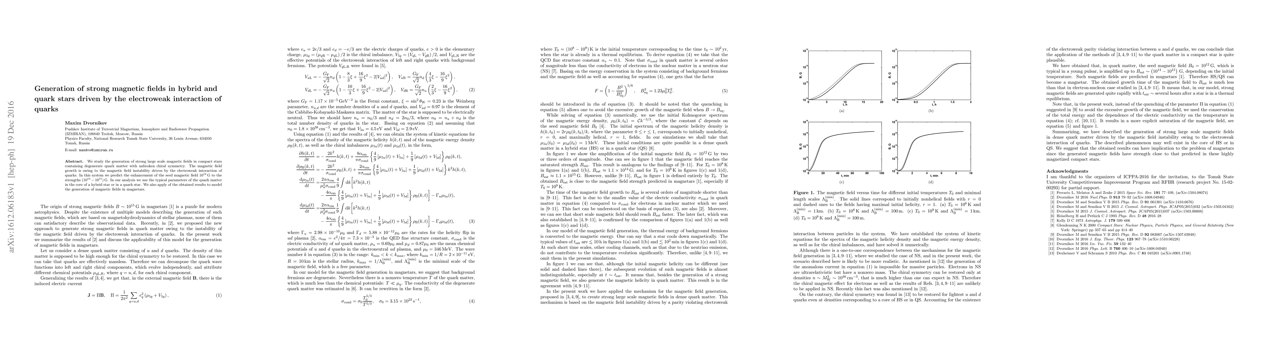 This paper investigates the generation of extremely strong magnetic fields in hybrid and quark stars through the electroweak interaction of quarks, predicting an enhancement of seed magnetic fields from $10^{12}$ G to $(10^{14}-10^{15})$ G due to magnetic field instability. The findings are applied to model magnetic field generation in magnetars.