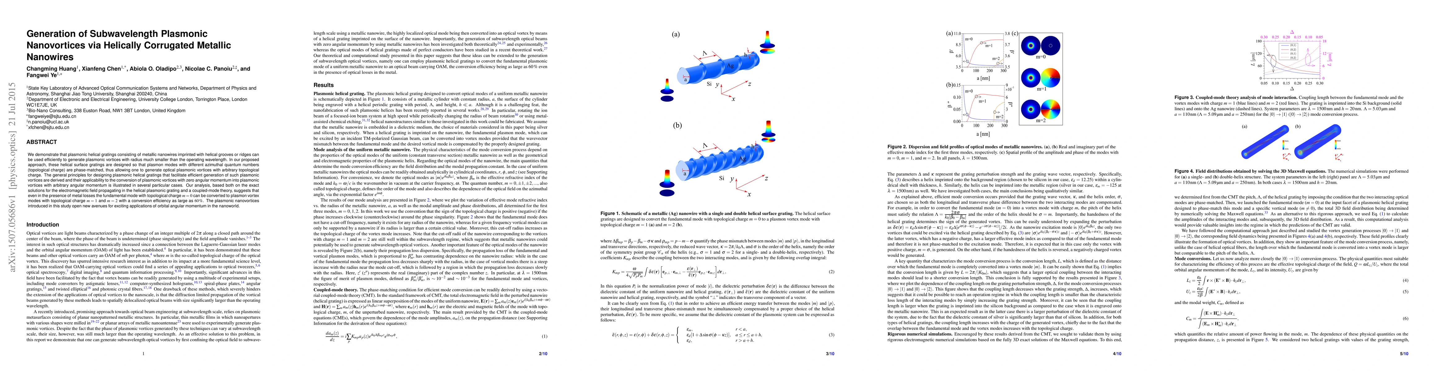 We demonstrate that plasmonic helical gratings consisting of metallic nanowires imprinted with helical grooves or ridges can be used efficiently to generate plasmonic vortices with radius much smaller than the operating wavelength. In our proposed approach, these helical surface gratings are designed so that plasmon modes with different azimuthal quantum numbers (topological charge) are phase-matched, thus allowing one to generate optical plasmonic vortices with arbitrary topological charge. The general principles for designing plasmonic helical gratings that facilitate efficient generation of such plasmonic vortices are derived and their applicability to the conversion of plasmonic vortices with zero angular momentum into plasmonic vortices with arbitrary angular momentum is illustrated in several particular cases. Our analysis, based both on the exact solutions for the electromagnetic field propagating in the helical plasmonic grating and a coupled-mode theory, suggests that even in the presence of metal losses the fundamental mode with topological charge m=0 can be converted to plasmon vortex modes with topological charge m=1 and m=2 with a conversion efficiency as large as 60%. The plasmonic nanovortices introduced in this study open new avenues for exciting applications of orbital angular momentum in the nanoworld.