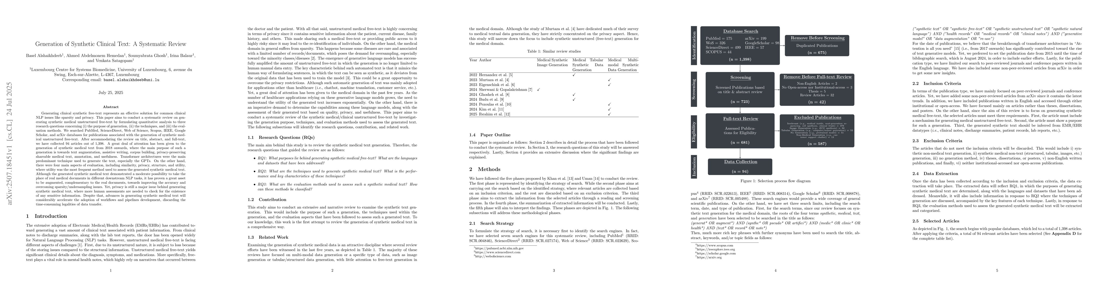 Generating clinical synthetic text represents an effective solution for common clinical NLP issues like sparsity and privacy. This paper aims to conduct a systematic review on generating synthetic medical free-text by formulating quantitative analysis to three research questions concerning (i) the purpose of generation, (ii) the techniques, and (iii) the evaluation methods. We searched PubMed, ScienceDirect, Web of Science, Scopus, IEEE, Google Scholar, and arXiv databases for publications associated with generating synthetic medical unstructured free-text. We have identified 94 relevant articles out of 1,398 collected ones. A great deal of attention has been given to the generation of synthetic medical text from 2018 onwards, where the main purpose of such a generation is towards text augmentation, assistive writing, corpus building, privacy-preserving, annotation, and usefulness. Transformer architectures were the main predominant technique used to generate the text, especially the GPTs. On the other hand, there were four main aspects of evaluation, including similarity, privacy, structure, and utility, where utility was the most frequent method used to assess the generated synthetic medical text. Although the generated synthetic medical text demonstrated a moderate possibility to act as real medical documents in different downstream NLP tasks, it has proven to be a great asset as augmented, complementary to the real documents, towards improving the accuracy and overcoming sparsity/undersampling issues. Yet, privacy is still a major issue behind generating synthetic medical text, where more human assessments are needed to check for the existence of any sensitive information. Despite that, advances in generating synthetic medical text will considerably accelerate the adoption of workflows and pipeline development, discarding the time-consuming legalities of data transfer.