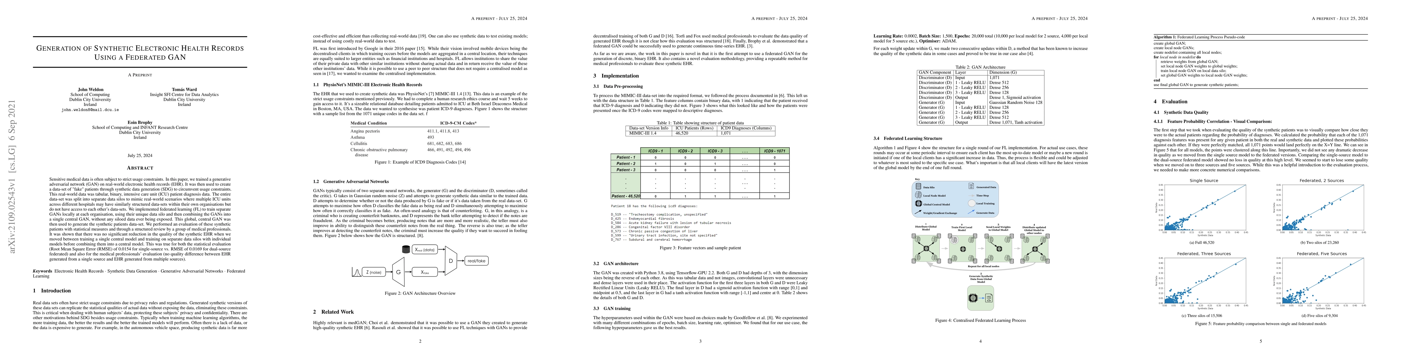 Sensitive medical data is often subject to strict usage constraints. In this paper, we trained a generative adversarial network (GAN) on real-world electronic health records (EHR). It was then used to create a data-set of "fake" patients through synthetic data generation (SDG) to circumvent usage constraints. This real-world data was tabular, binary, intensive care unit (ICU) patient diagnosis data. The entire data-set was split into separate data silos to mimic real-world scenarios where multiple ICU units across different hospitals may have similarly structured data-sets within their own organisations but do not have access to each other's data-sets. We implemented federated learning (FL) to train separate GANs locally at each organisation, using their unique data silo and then combining the GANs into a single central GAN, without any siloed data ever being exposed. This global, central GAN was then used to generate the synthetic patients data-set. We performed an evaluation of these synthetic patients with statistical measures and through a structured review by a group of medical professionals. It was shown that there was no significant reduction in the quality of the synthetic EHR when we moved between training a single central model and training on separate data silos with individual models before combining them into a central model. This was true for both the statistical evaluation (Root Mean Square Error (RMSE) of 0.0154 for single-source vs. RMSE of 0.0169 for dual-source federated) and also for the medical professionals' evaluation (no quality difference between EHR generated from a single source and EHR generated from multiple sources).