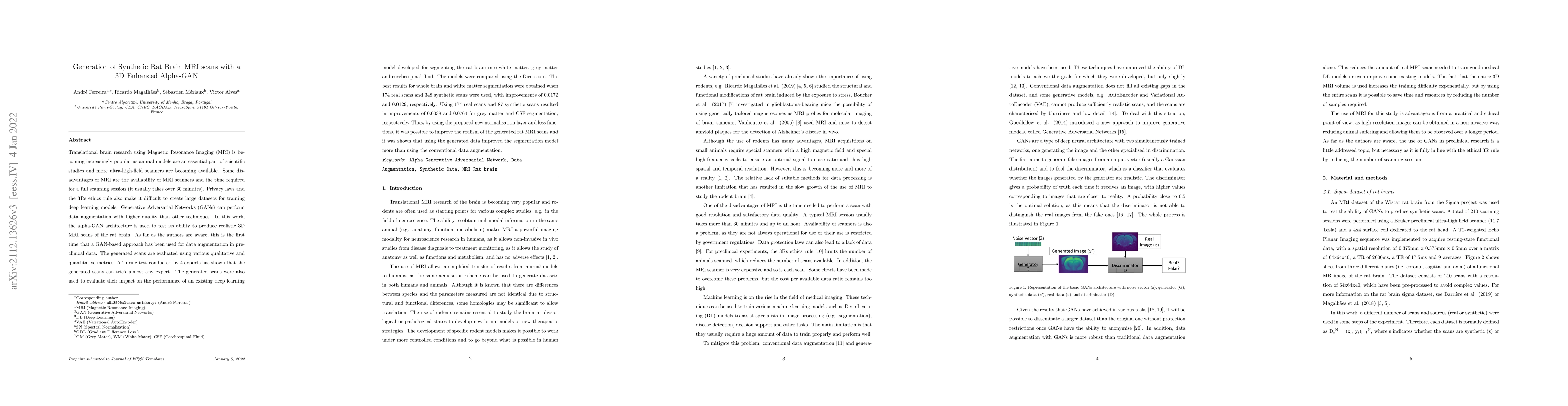 This paper uses an enhanced Alpha-GAN to generate synthetic rat brain MRI scans, aiming to address the limitations of traditional MRI data collection. The generated scans were shown to be highly realistic, improving the performance of a deep learning model for brain tissue segmentation when used alongside real scans.
