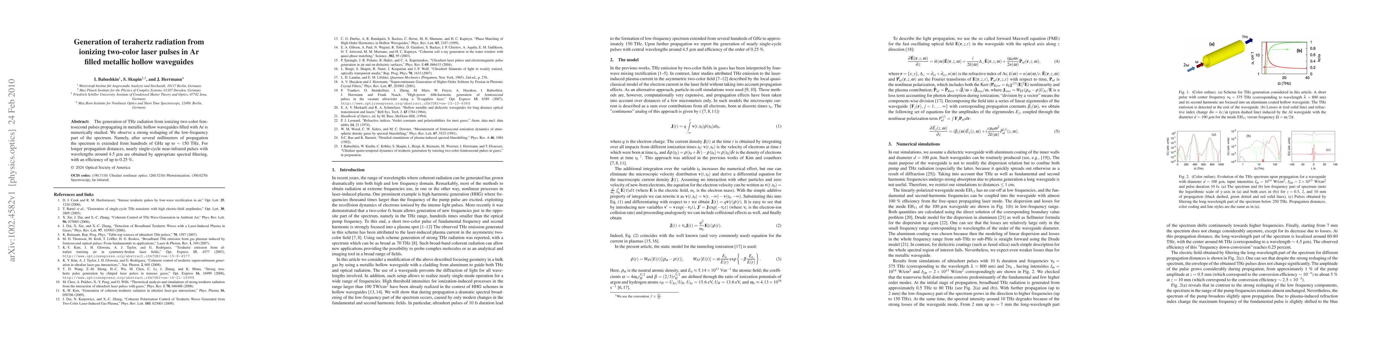 This paper investigates the generation of terahertz radiation using ionizing two-color femtosecond laser pulses in Ar-filled metallic hollow waveguides, observing a spectrum extension up to ~150 THz and achieving nearly single-cycle near-infrared pulses with 4.5 µm wavelengths after spectral filtering, with an efficiency of up to 0.25%.