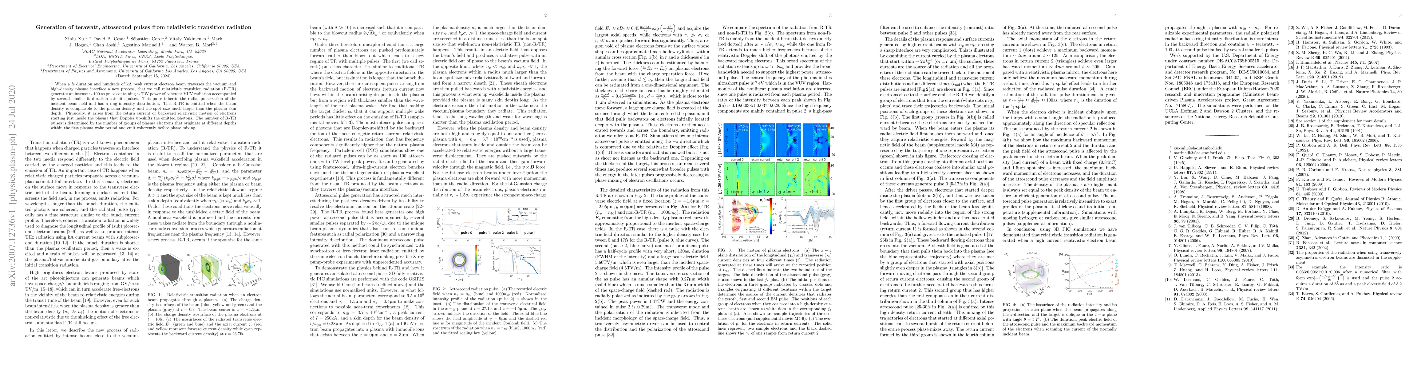 When a fs duration and hundreds of kA peak current electron beam traverses the vacuum and high-density plasma interface a new process, that we call relativistic transition radiation (R-TR) generates an intense $\sim100$ as pulse containing $\sim$ TW power of coherent VUV radiation accompanied by several smaller fs duration satellite pulses. This pulse inherits the radial polarization of the incident beam field and has a ring intensity distribution. This R-TR is emitted when the beam density is comparable to the plasma density and the spot size much larger than the plasma skin depth. Physically, it arises from the return current or backward relativistic motion of electrons starting just inside the plasma that Doppler up-shifts the emitted photons. The number of R-TR pulses is determined by the number of groups of plasma electrons that originate at different depths within the first plasma wake period and emit coherently before phase mixing.