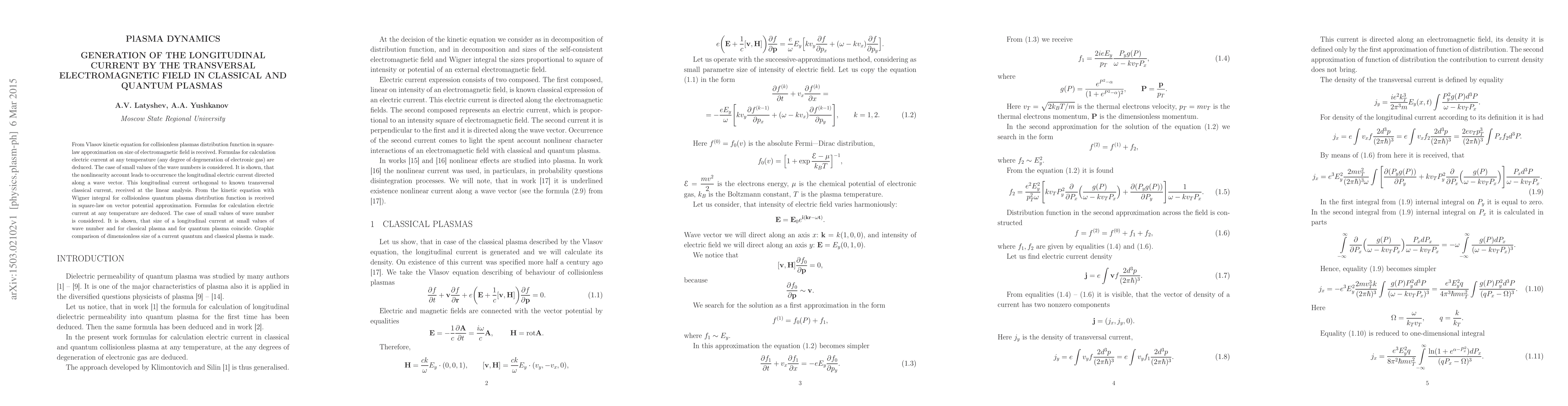 This paper investigates the generation of longitudinal current in plasmas driven by transversal electromagnetic fields, both classically and quantum mechanically. It derives formulas for electric current at various temperatures and shows that nonlinearity results in a longitudinal current orthogonal to the classical transversal current, with quantum and classical plasmas exhibiting similar longitudinal current behavior for small wave numbers.
