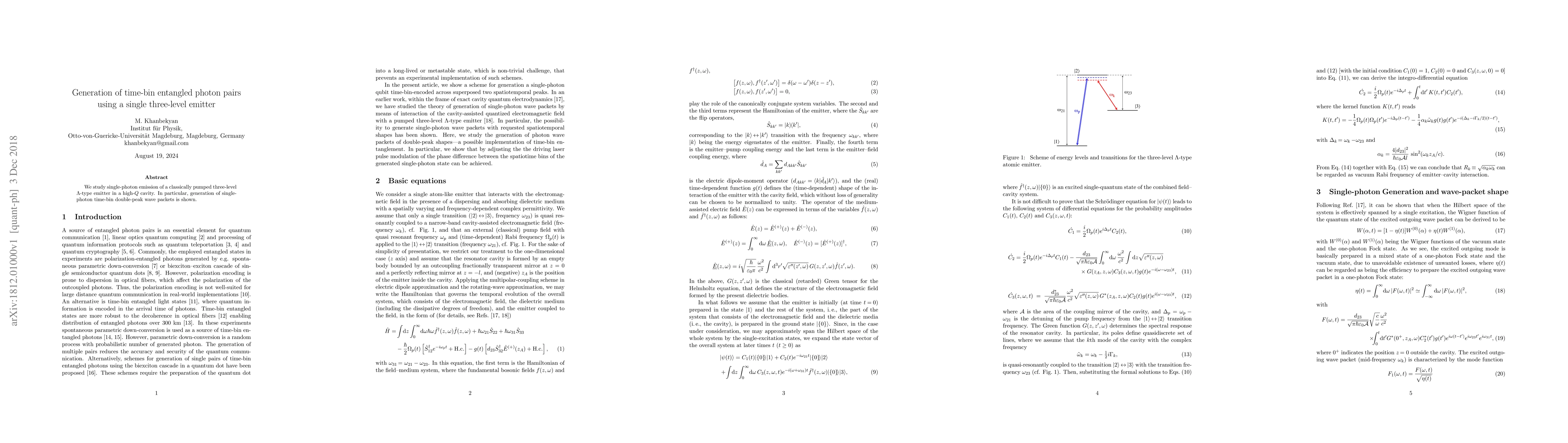 Summary: This paper investigates the emission of time-bin entangled photon pairs from a $\Lambda$-type three-level emitter within a high-$Q$ cavity, demonstrating the generation of single-photon time-bin double-peak wave packets.