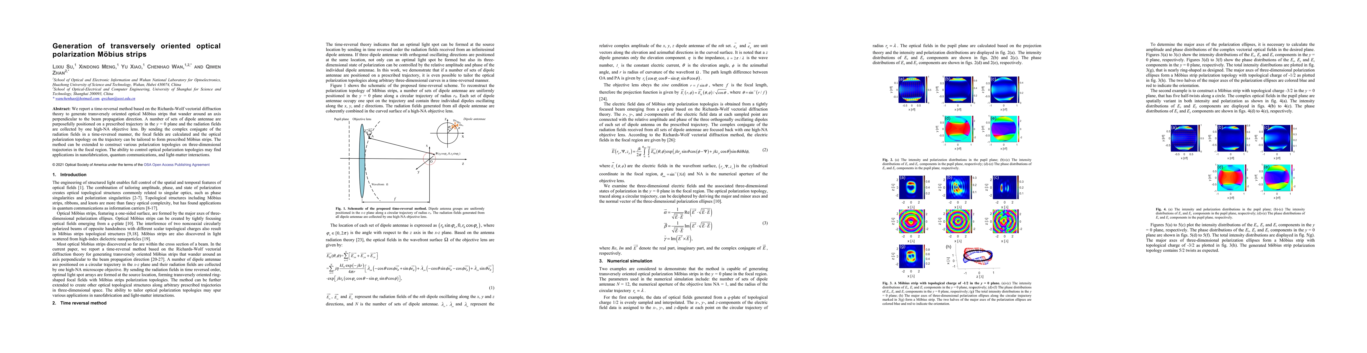 This paper presents a novel time-reversal method based on Richards-Wolf theory to generate transversely oriented optical Möbius strips using strategically positioned dipole antennae and a high-NA objective lens. This technique can tailor polarization topologies for potential applications in nanofabrication, quantum communications, and light-matter interactions.